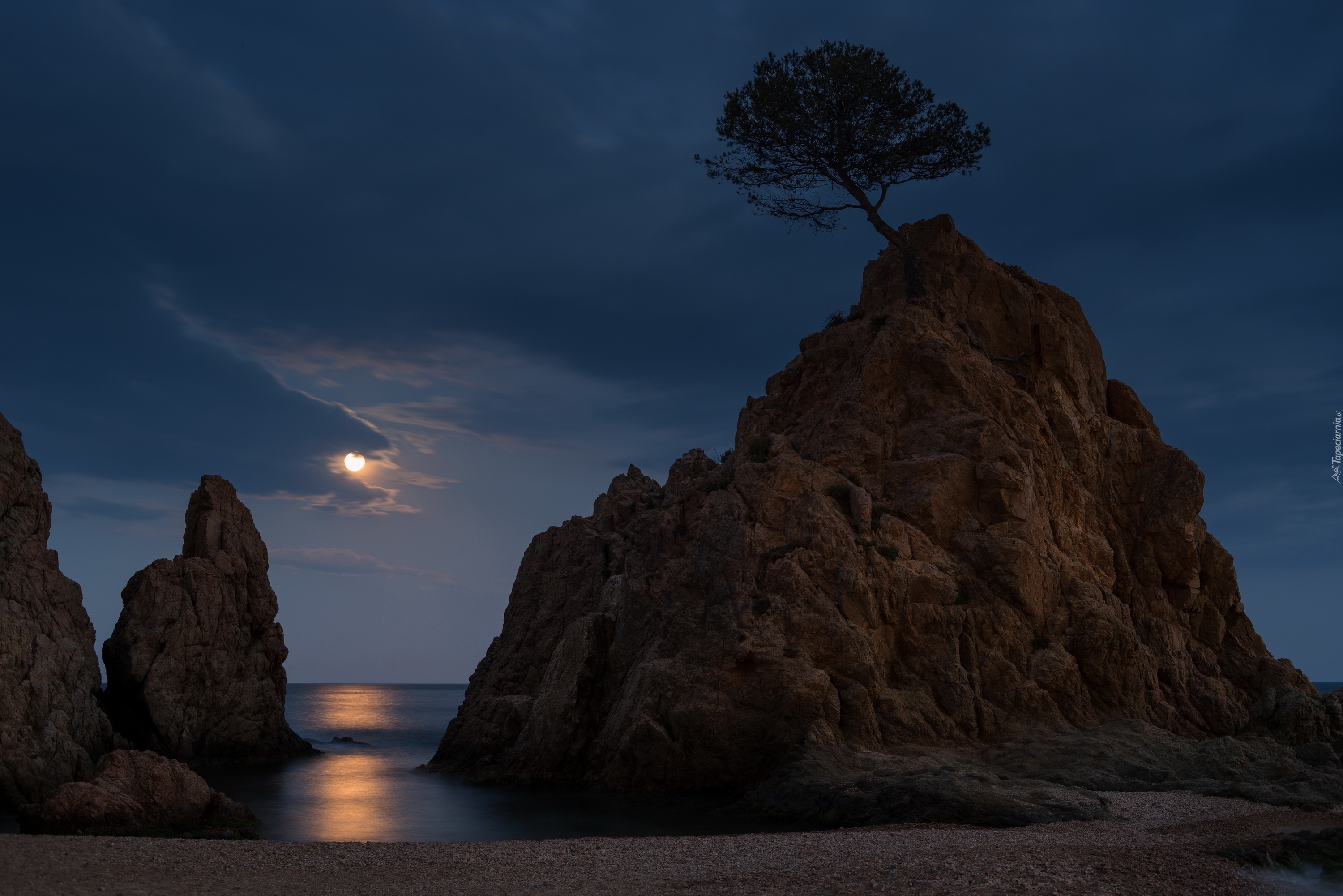Edytor tapety: Morze, Skały, Drzewo, Chmury, Księżyc
