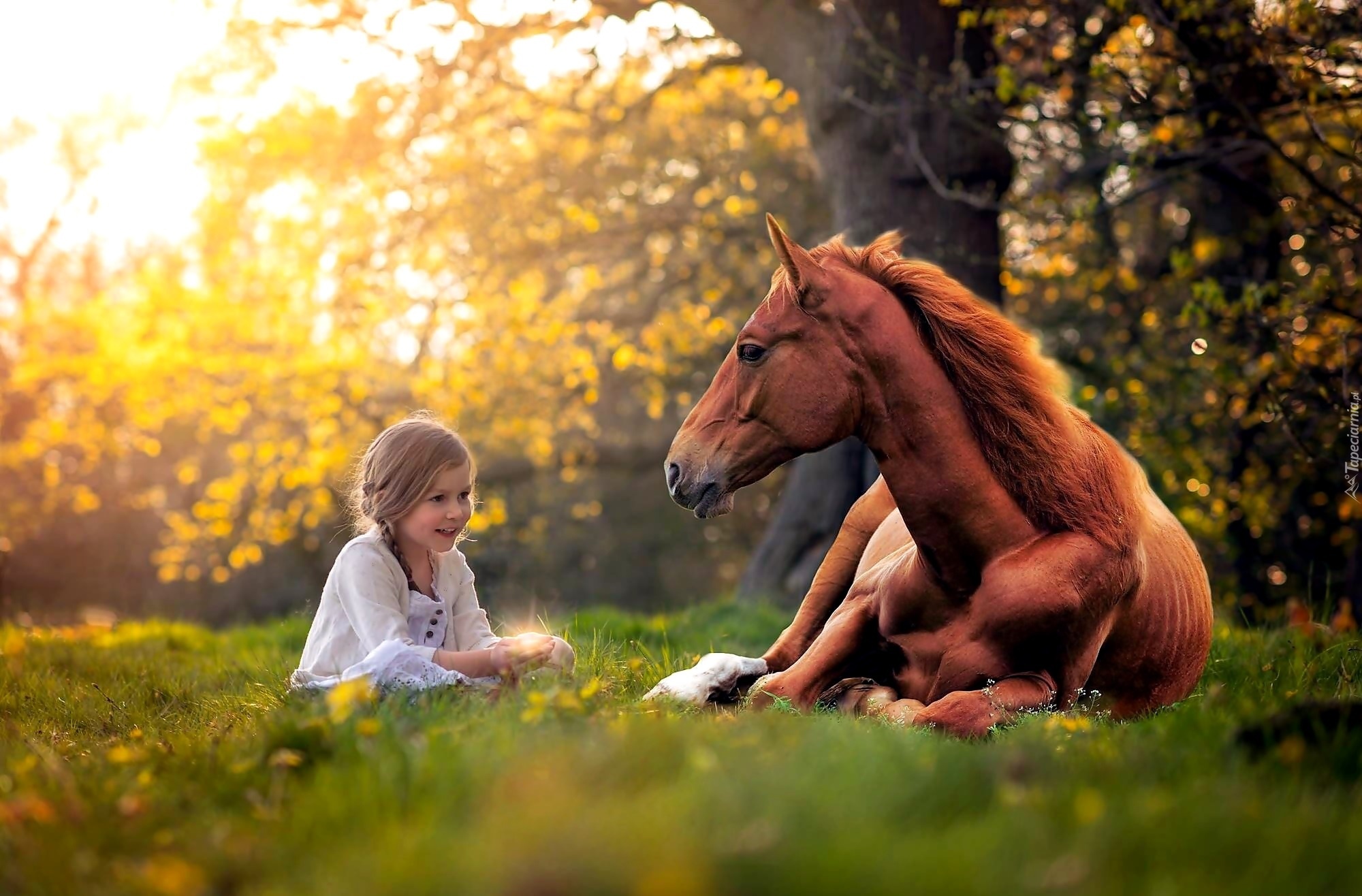 Edytor tapety: Koń, Dziewczynka, Łąka, Drzewo