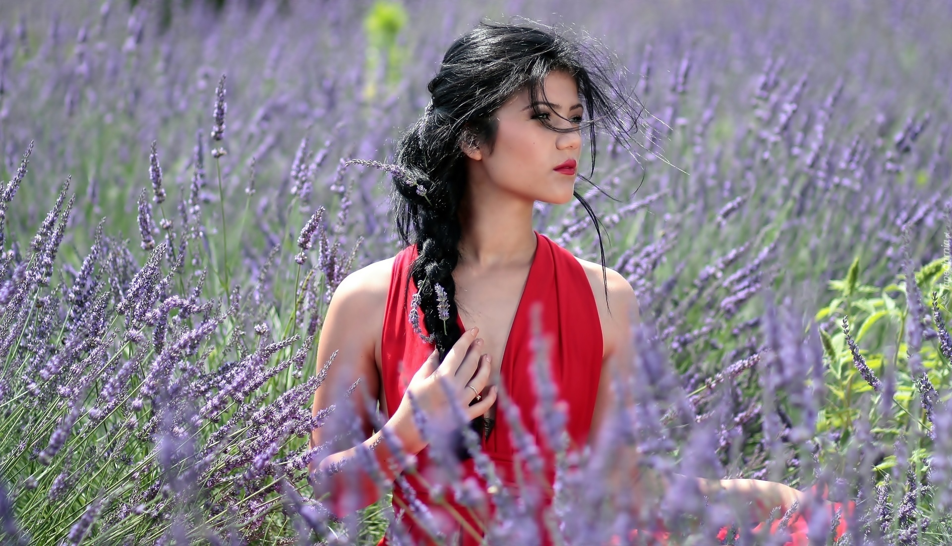 Edytor tapety: Dziewczyna, Brunetka, Czerwona, Sukienka, Warkocz, Pole, Lawendowe