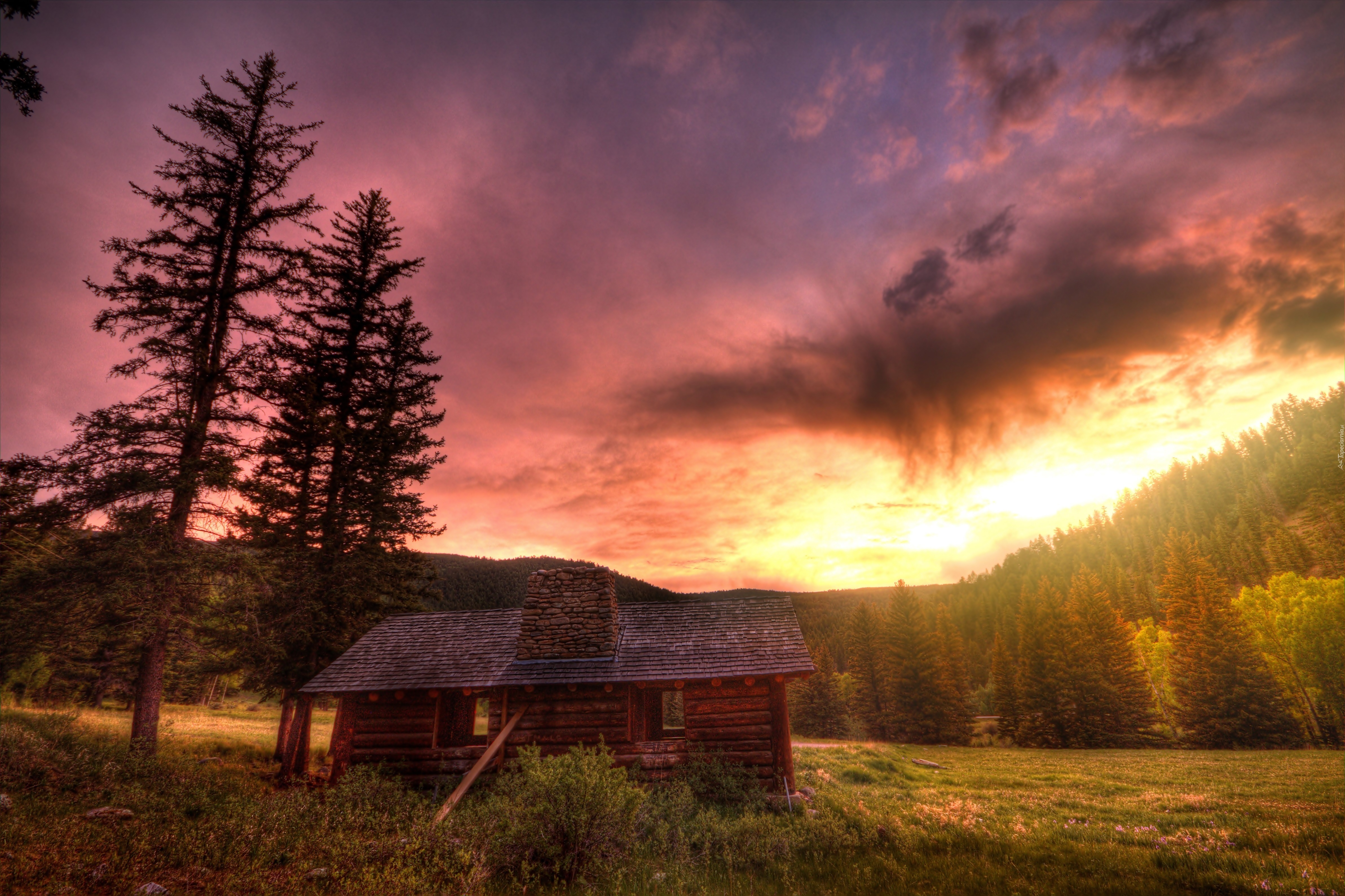 Edytor tapety: Las, Pole, Dom, Drzewa, Niebo, Zachód słońca