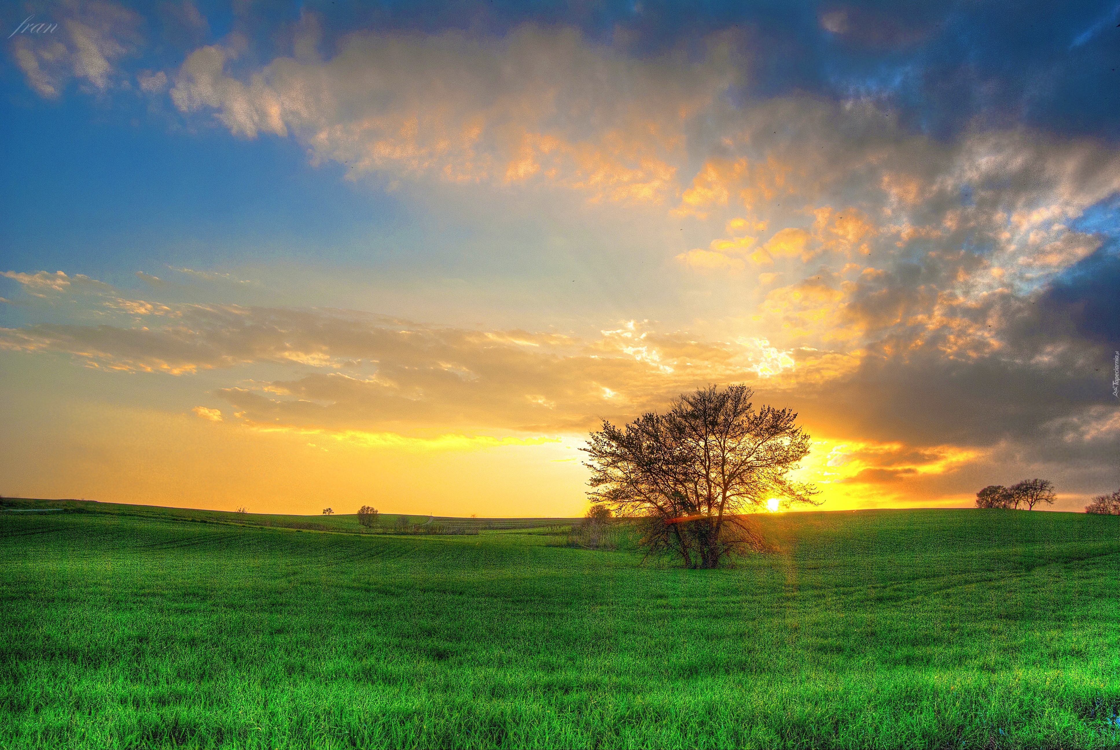 Edytor tapety: Pole, Zachód słońca, Drzewa, Chmury