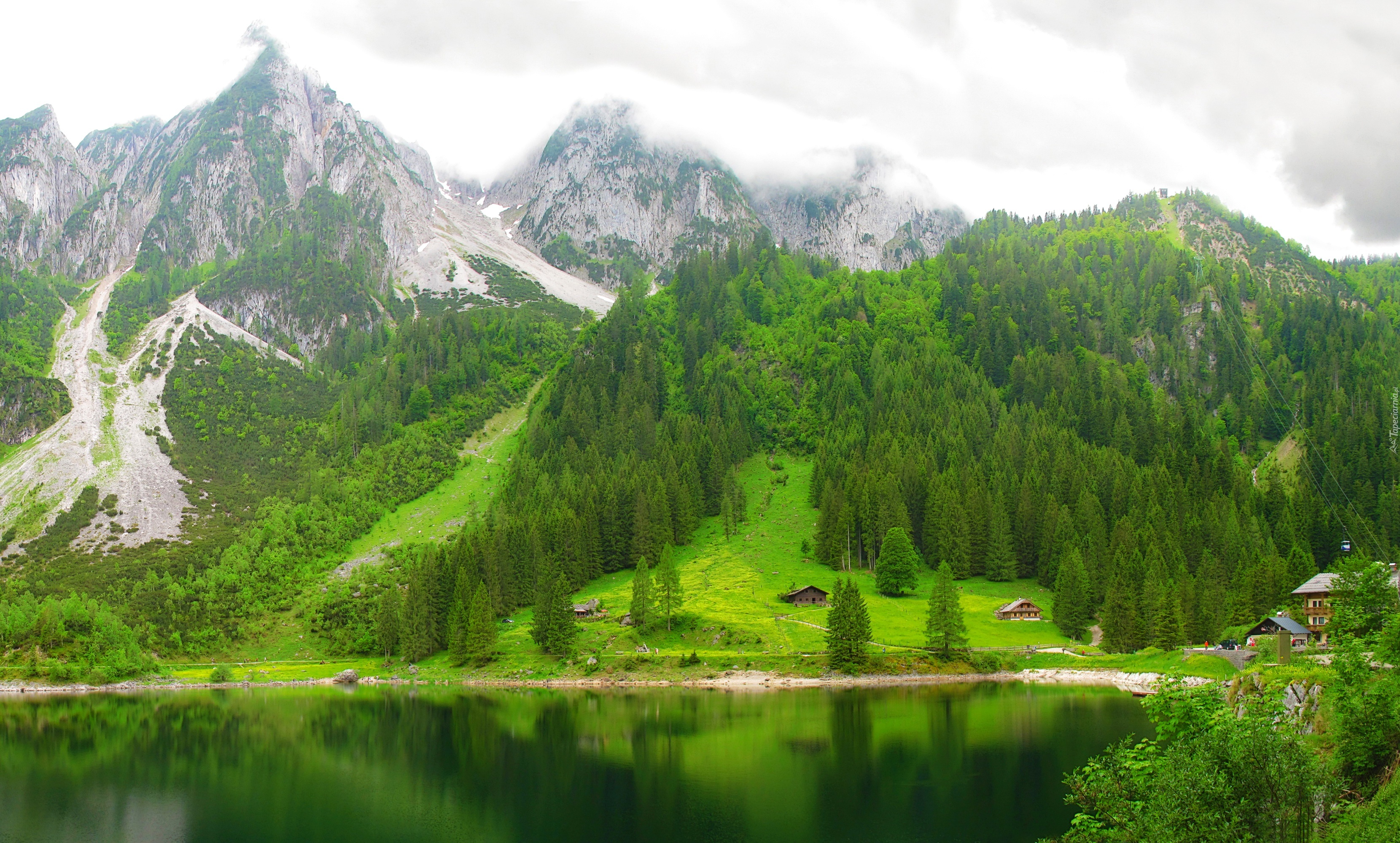 Edytor tapety: Góry, Jezioro, Drzewa, Budynki