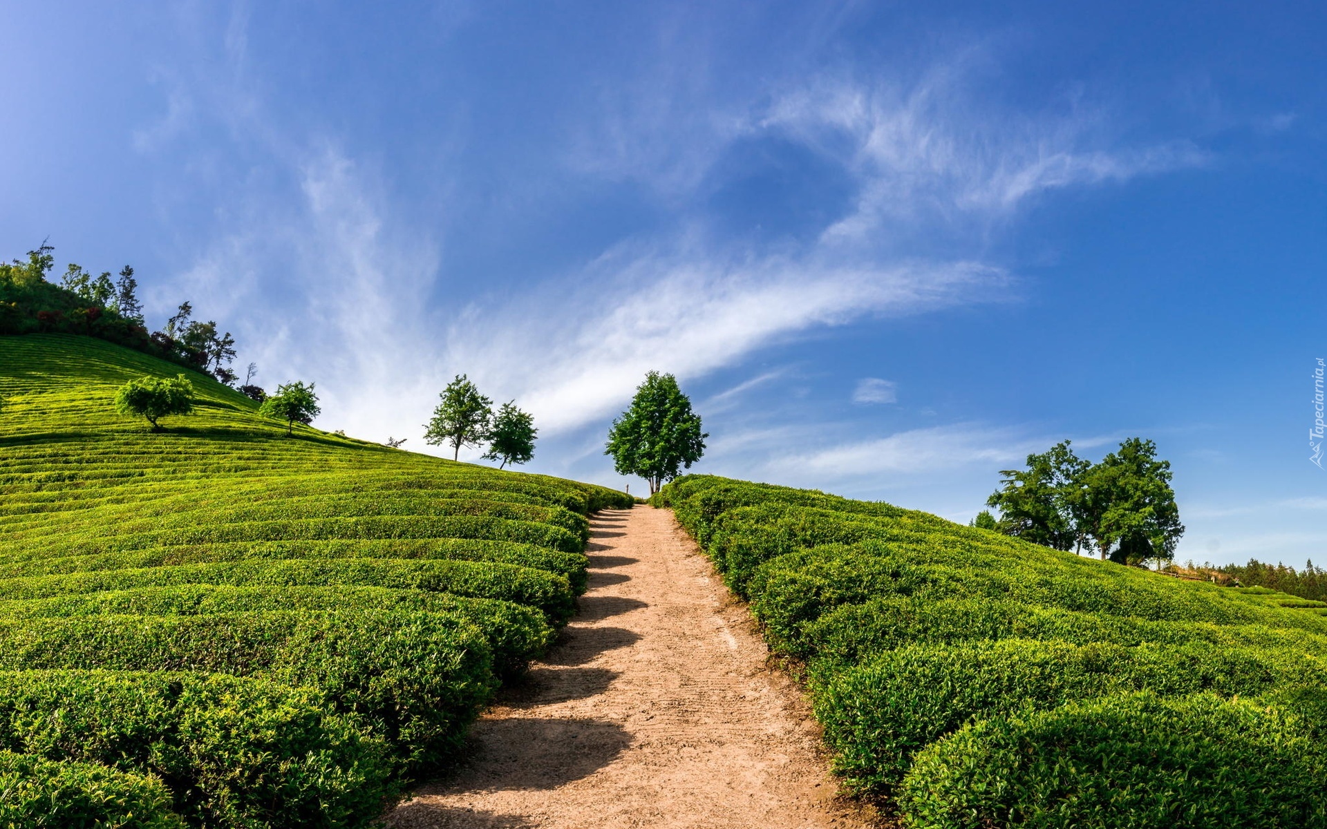 Edytor tapety: Droga, Grządki, Drzewa, Chmury, Niebo
