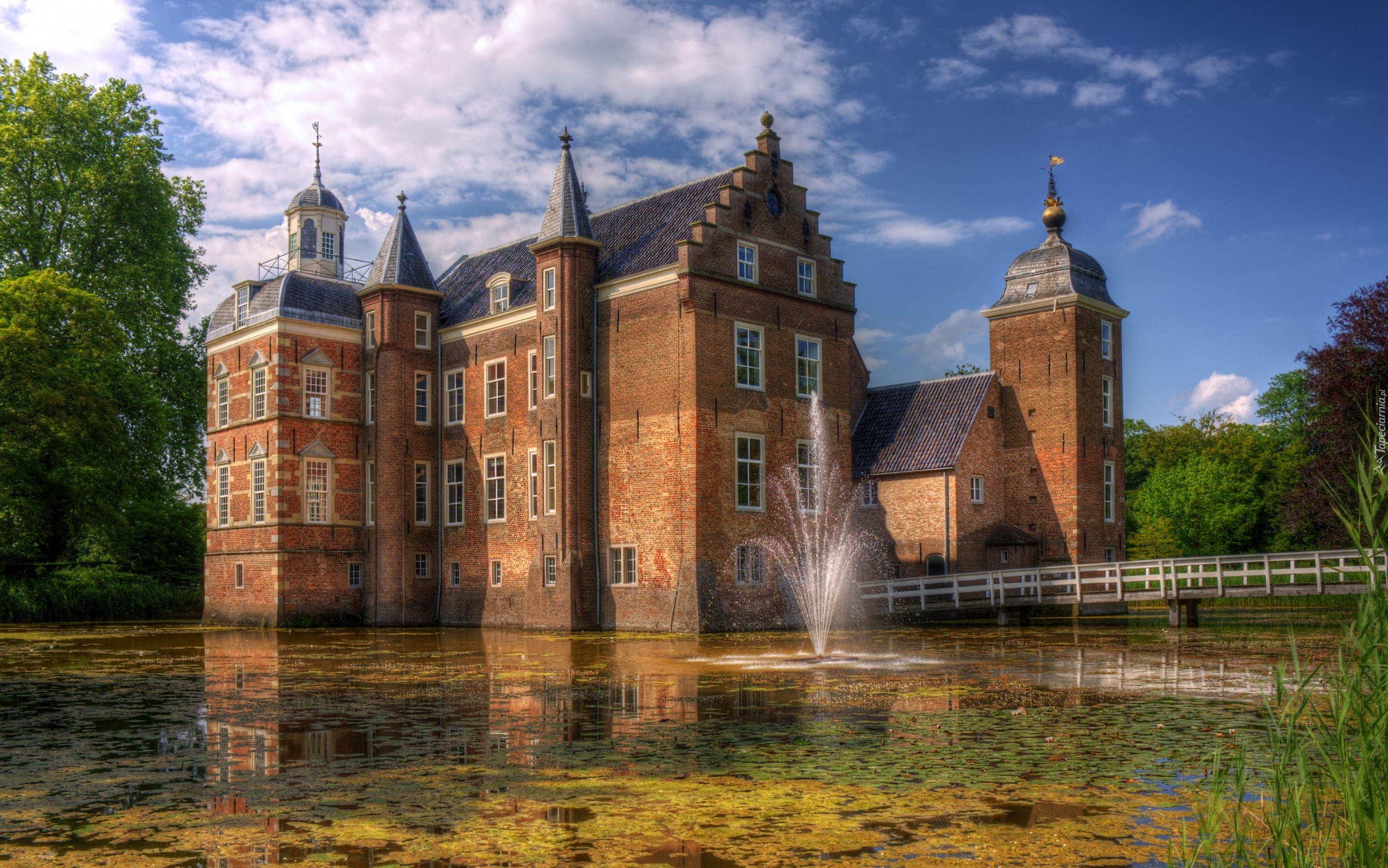 Edytor tapety: Zamek Ruurlo, Gmina Berkelland, Prowincja Gelderland, Holandia, Staw, Fontanna