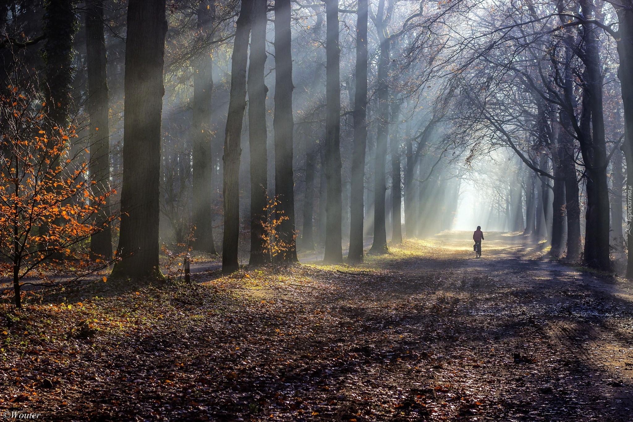 Edytor tapety: Las, Droga, Drzewa, Przebijające, Światło, Człowiek, Rower