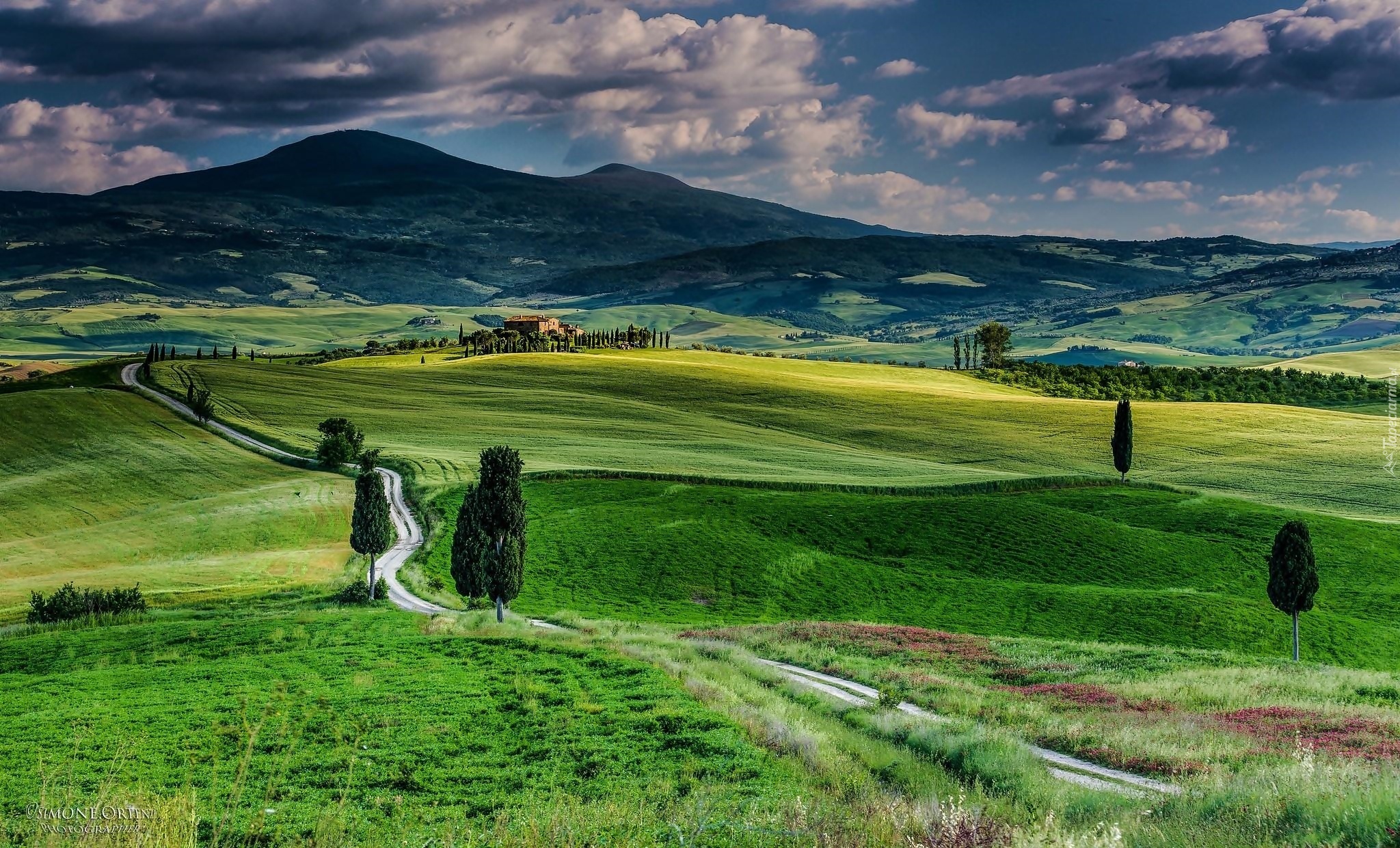 Edytor tapety: Droga, Drzewa, Łąki, Wzgórza, Krajobraz, Toskanii, Włochy