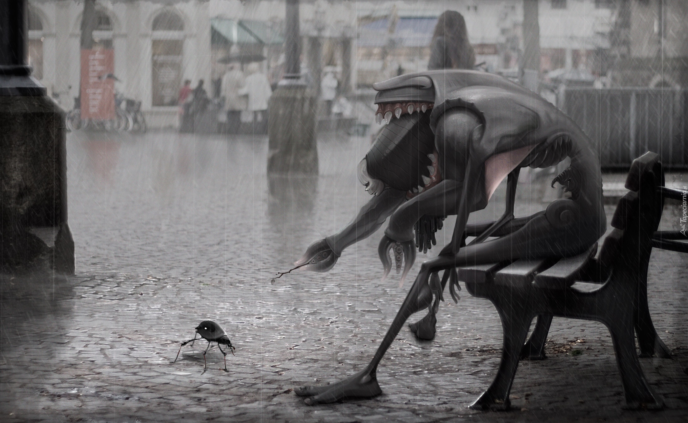 Edytor tapety: Deszcz, Stwór, Ławka, Miasto