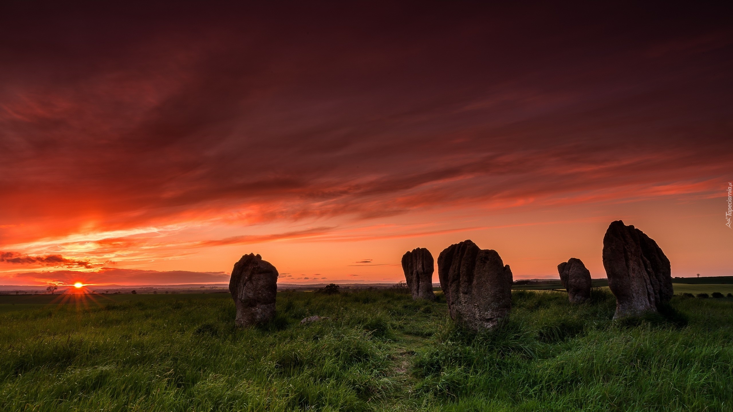 Edytor tapety: Zachód Słońca, Chmury, Łąka, Głazy