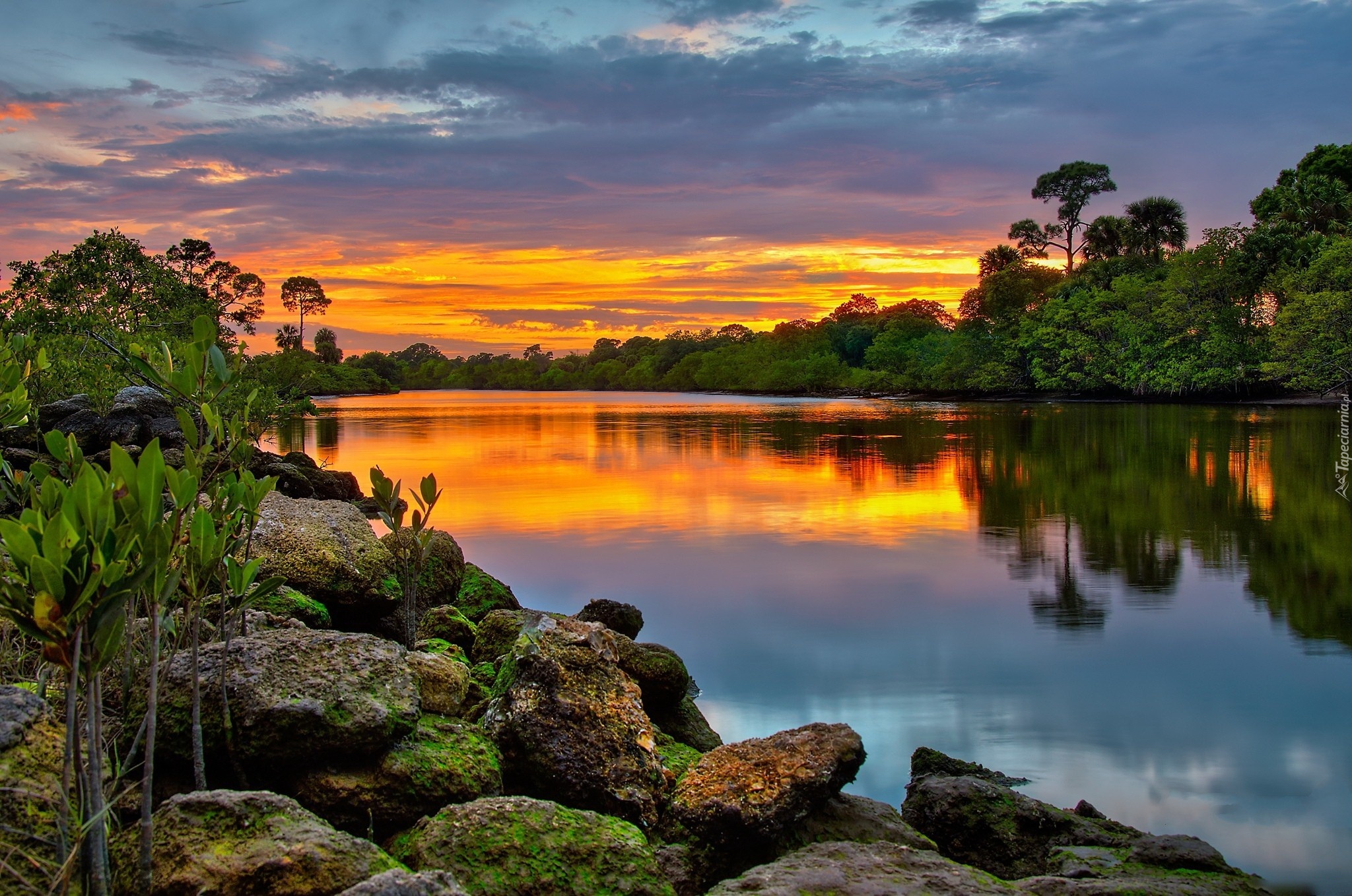 Edytor tapety: Jezioro, Kamienie, Zachód, Słońca, drzewa