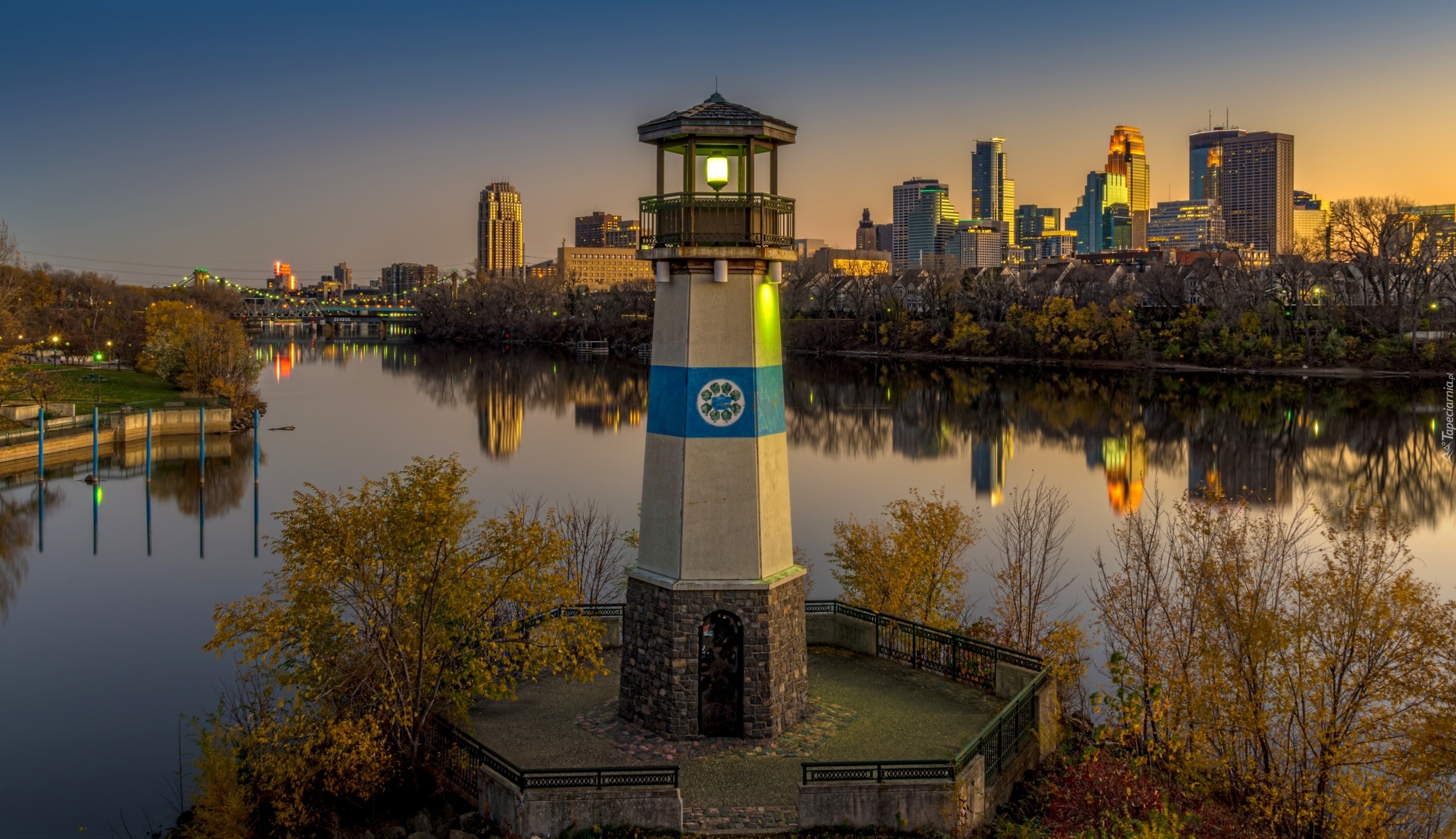 Edytor tapety: Latarnia, Woda, Miasto, Drzewa, Odbicie