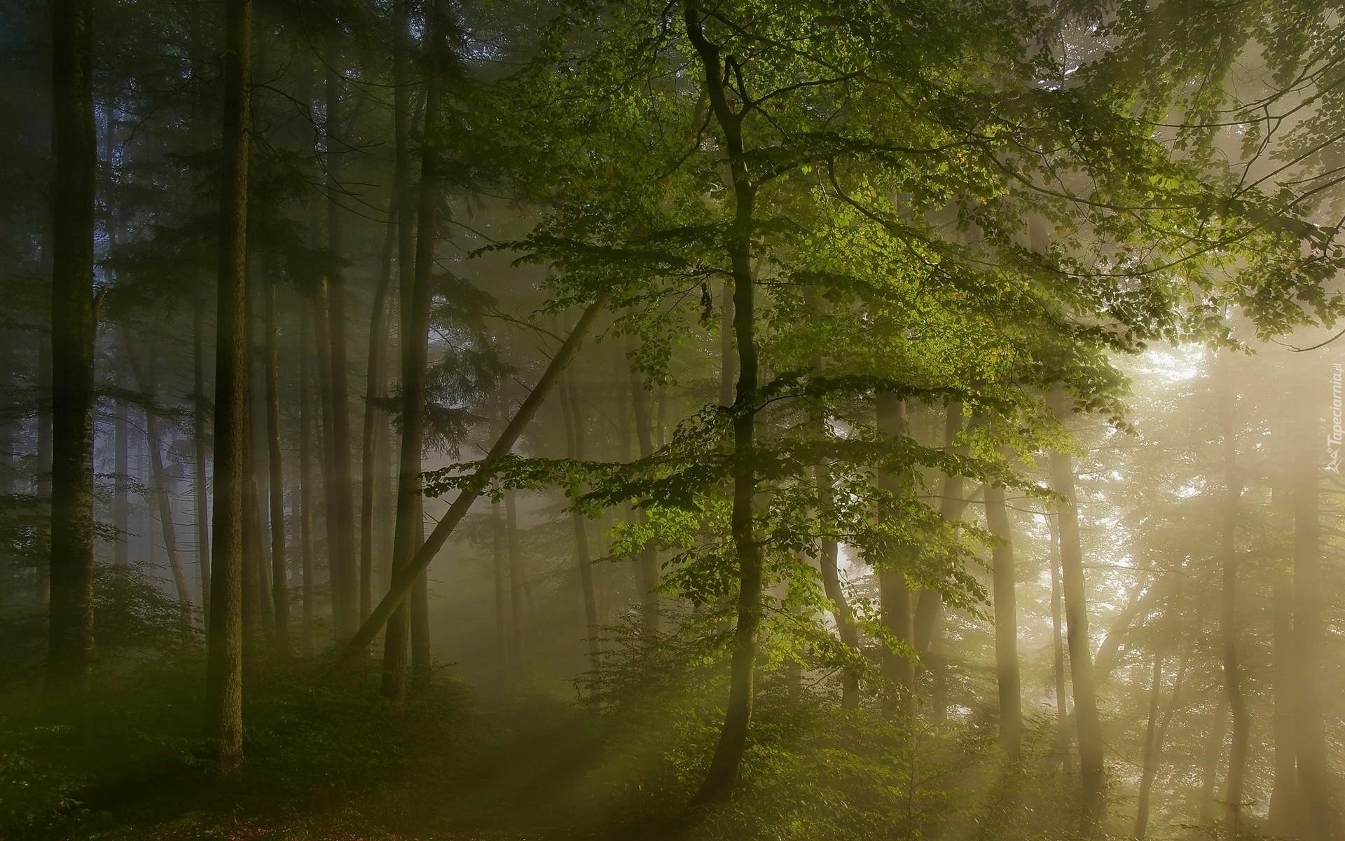 Edytor tapety: Las, Drzewa, Mgła, Przebijające, Światło