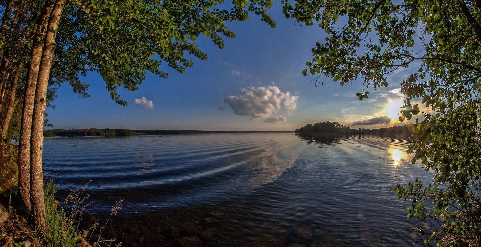 Edytor tapety: Jezioro, Drzewa, Wschód, Słońca