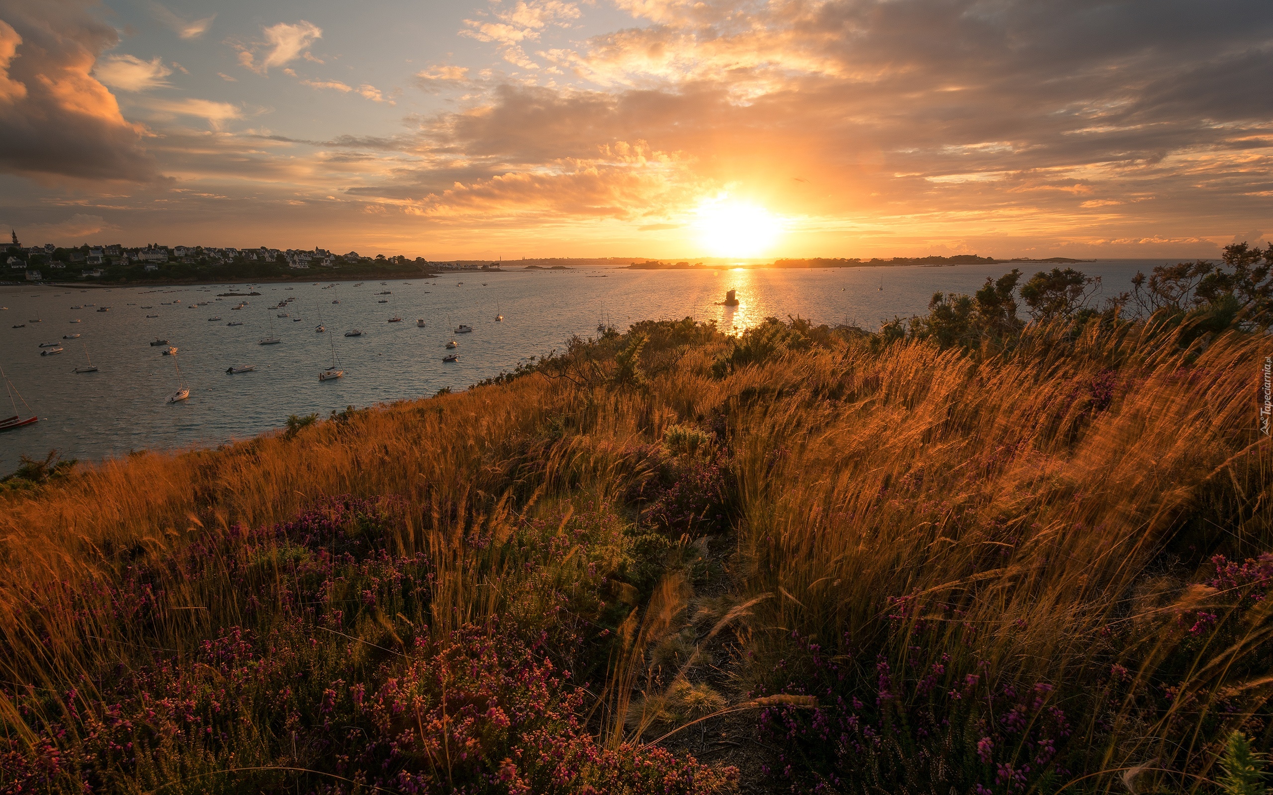 Edytor tapety: Morze, Zachód słońca, Statki , Roślinność