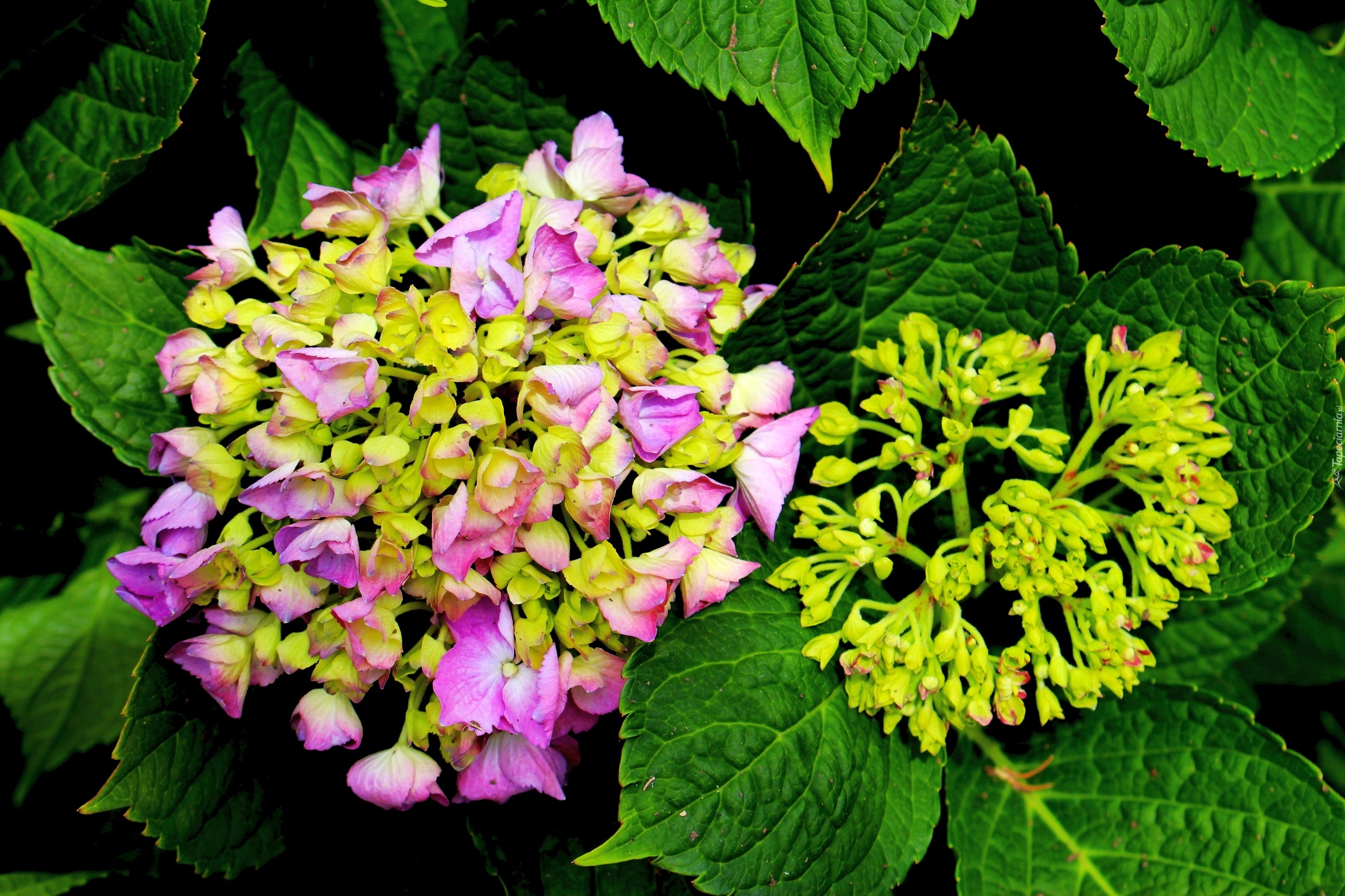 Edytor tapety: Hortensja, Różowa, Liście, Ogród