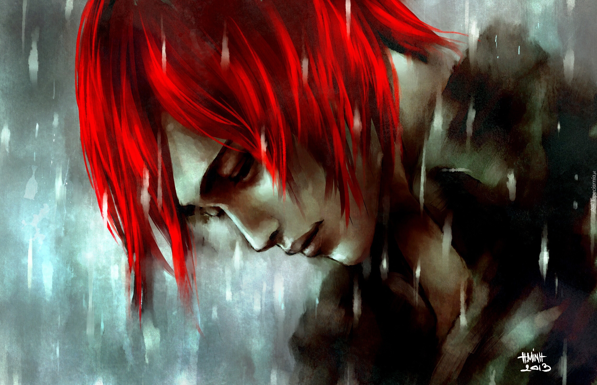 Edytor tapety: Smutna, Postać, Czerwone, Włosy, Deszcz, Obraz