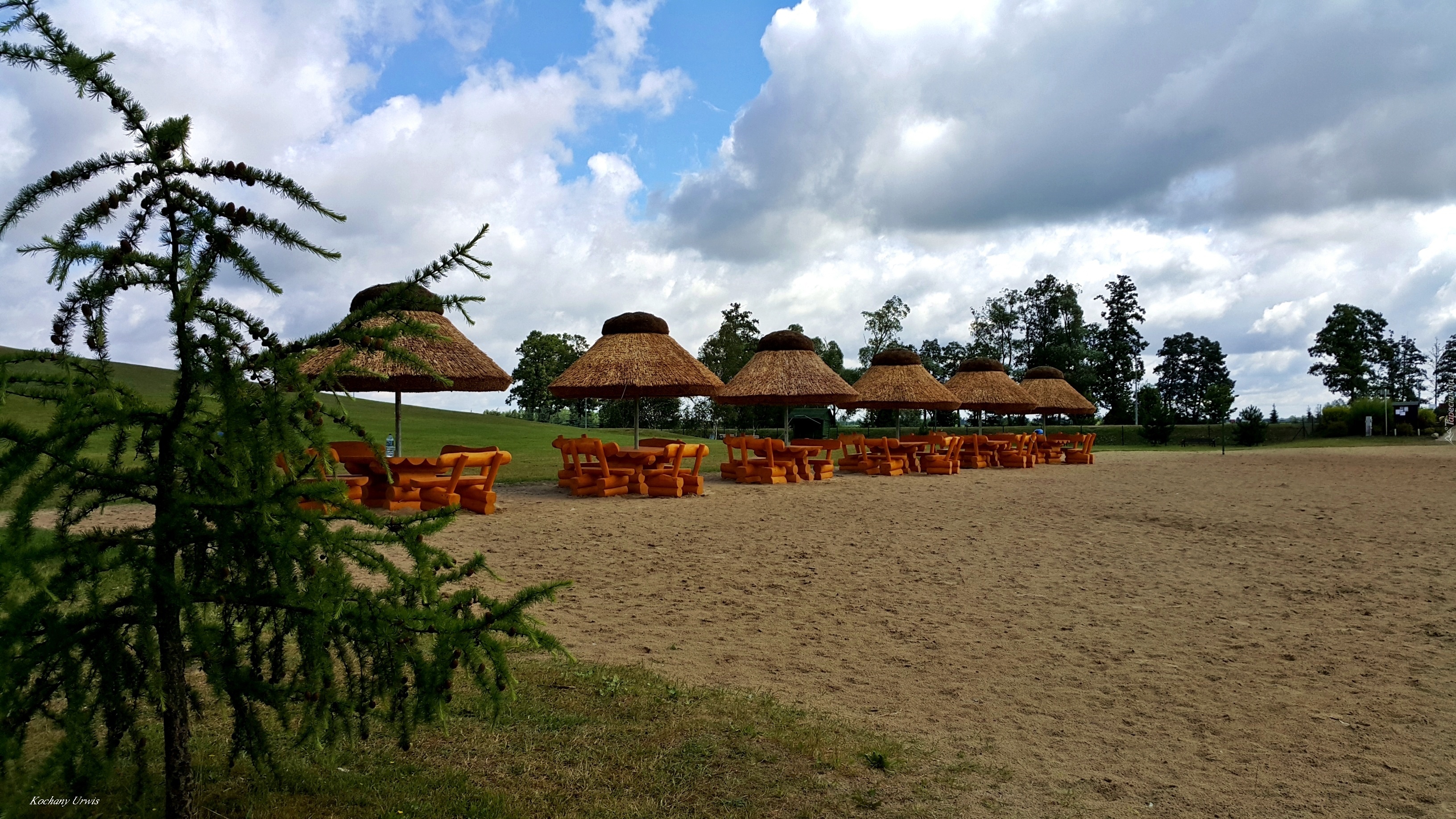 Edytor tapety: Niebo, Chmury, Piasek, Drzewa, Parasole, Ławki