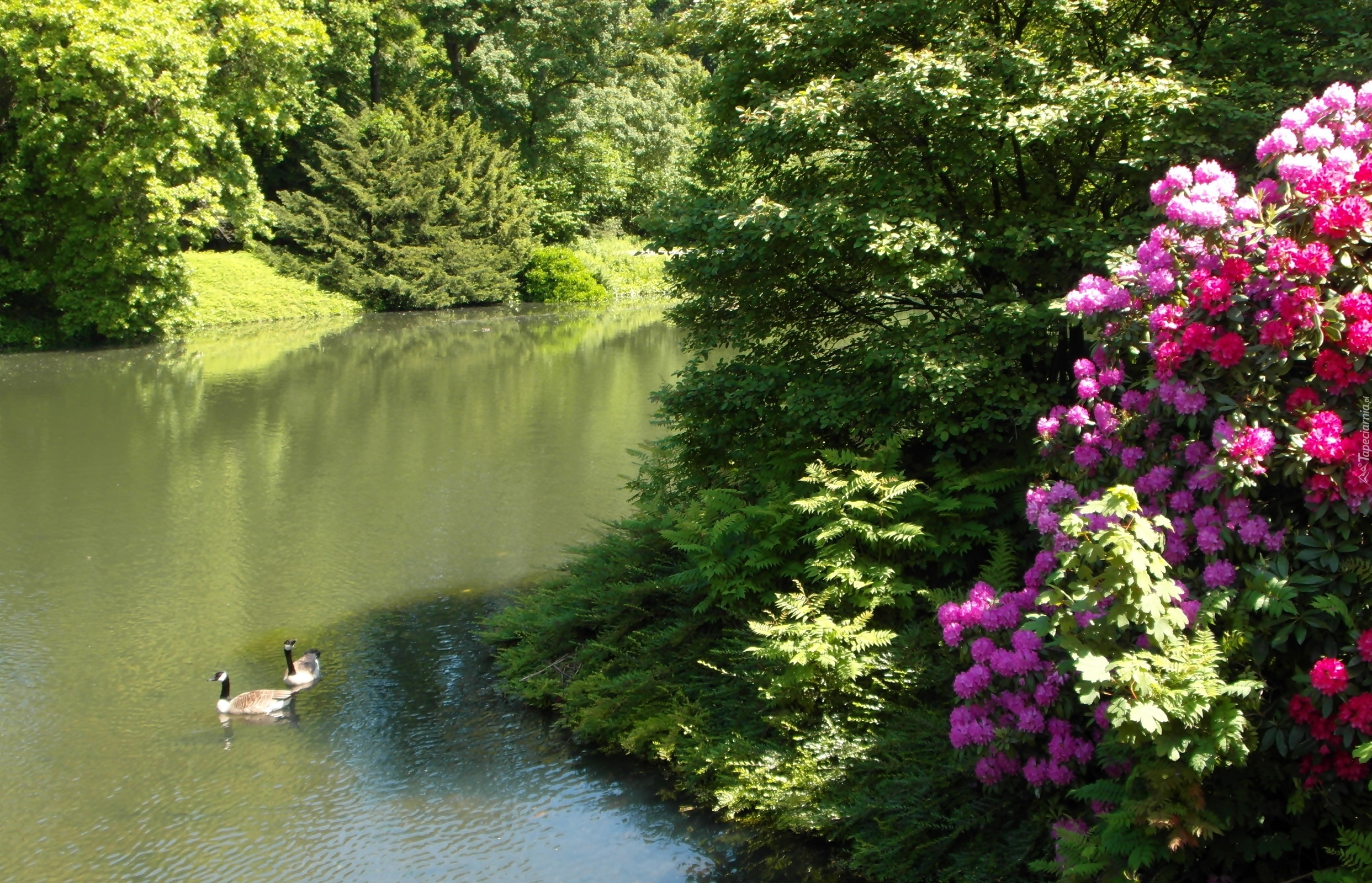 Edytor tapety: Grugapark, Essen, Staw, Kaczki, Krzewy, Rododendron, Niemcy