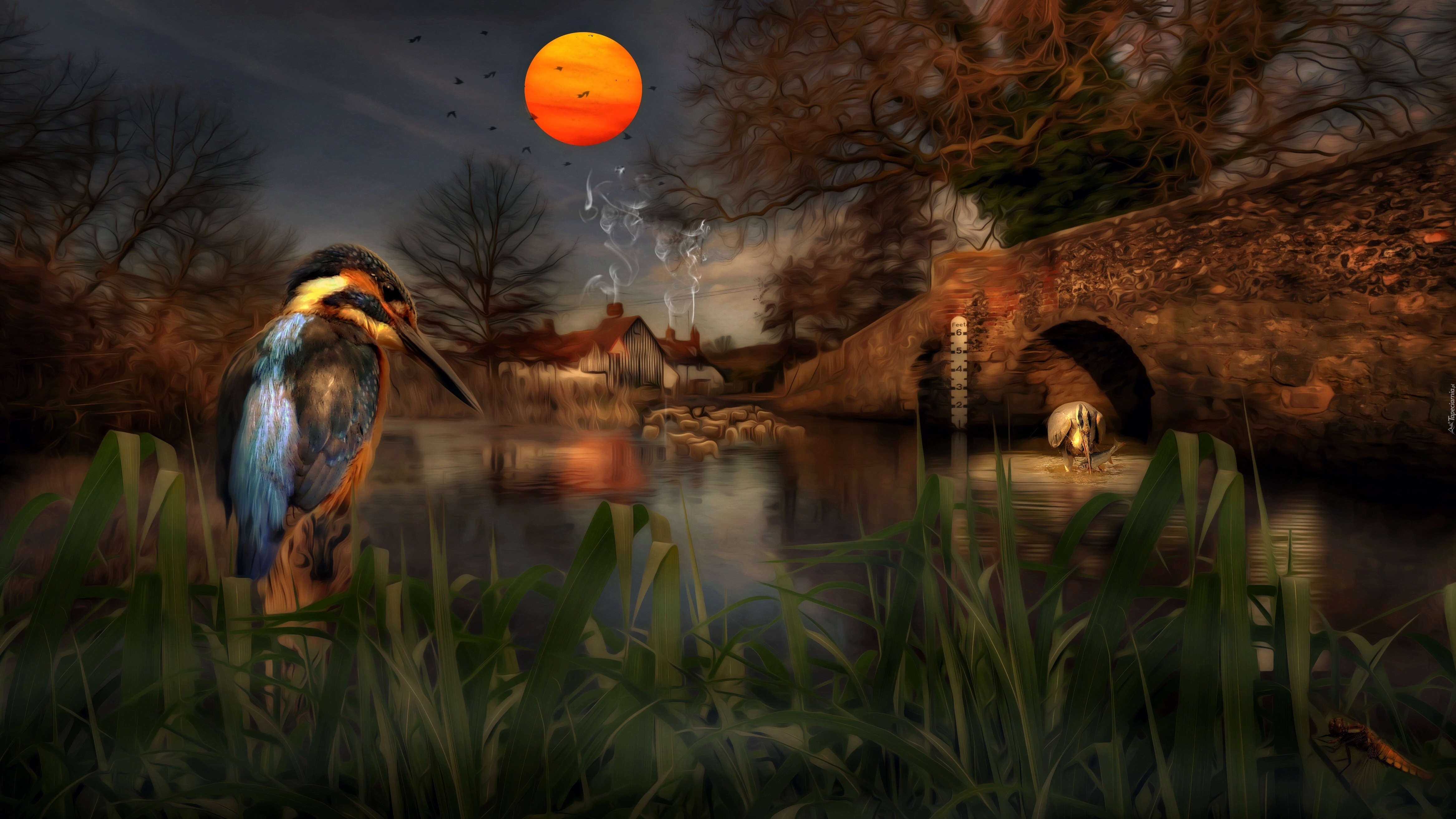 Edytor tapety: Zimorodek, Rzeka, Most, Księżyc