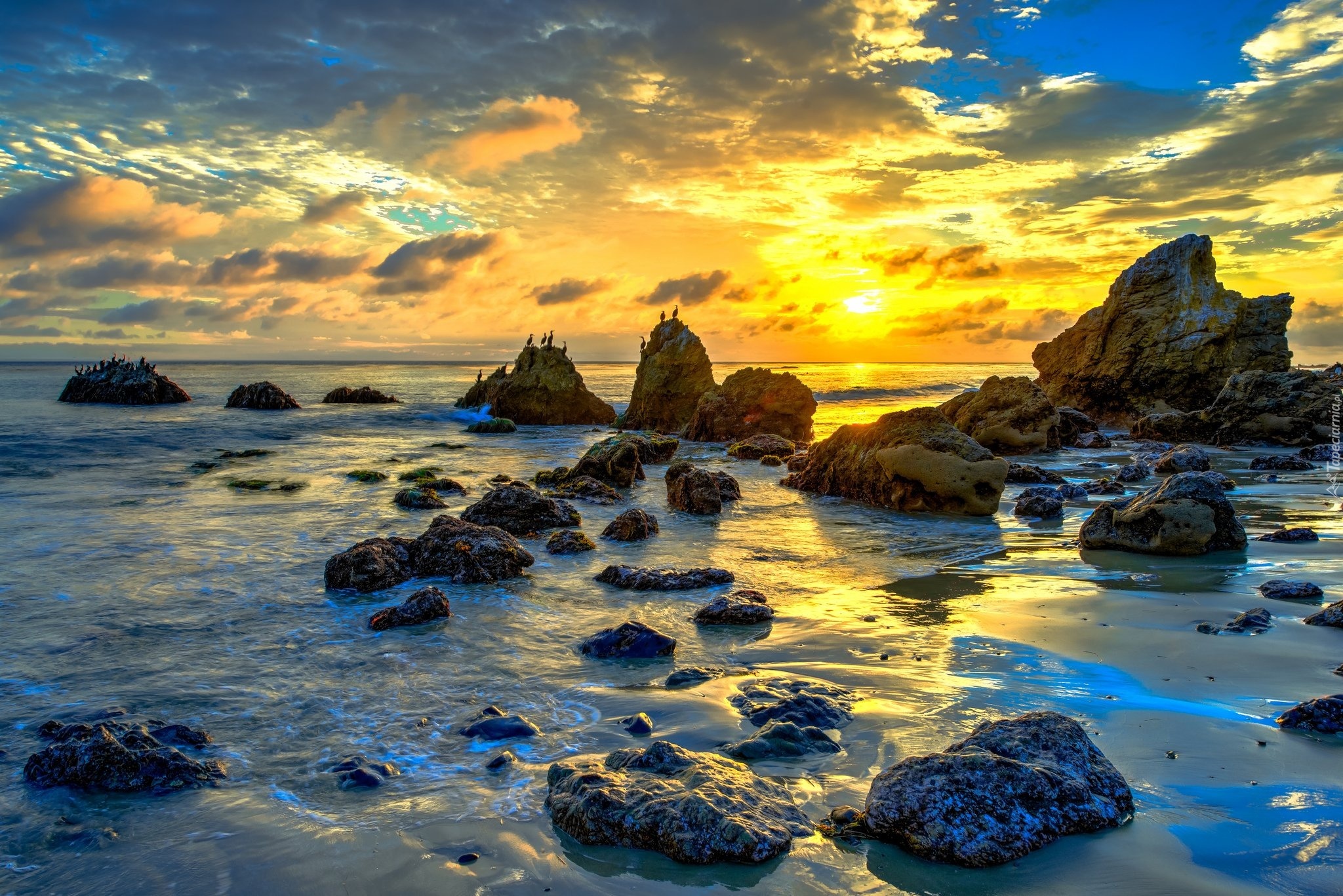 Edytor tapety: Morze, Skały, Kamienie, Zachód słońca, Chmury
