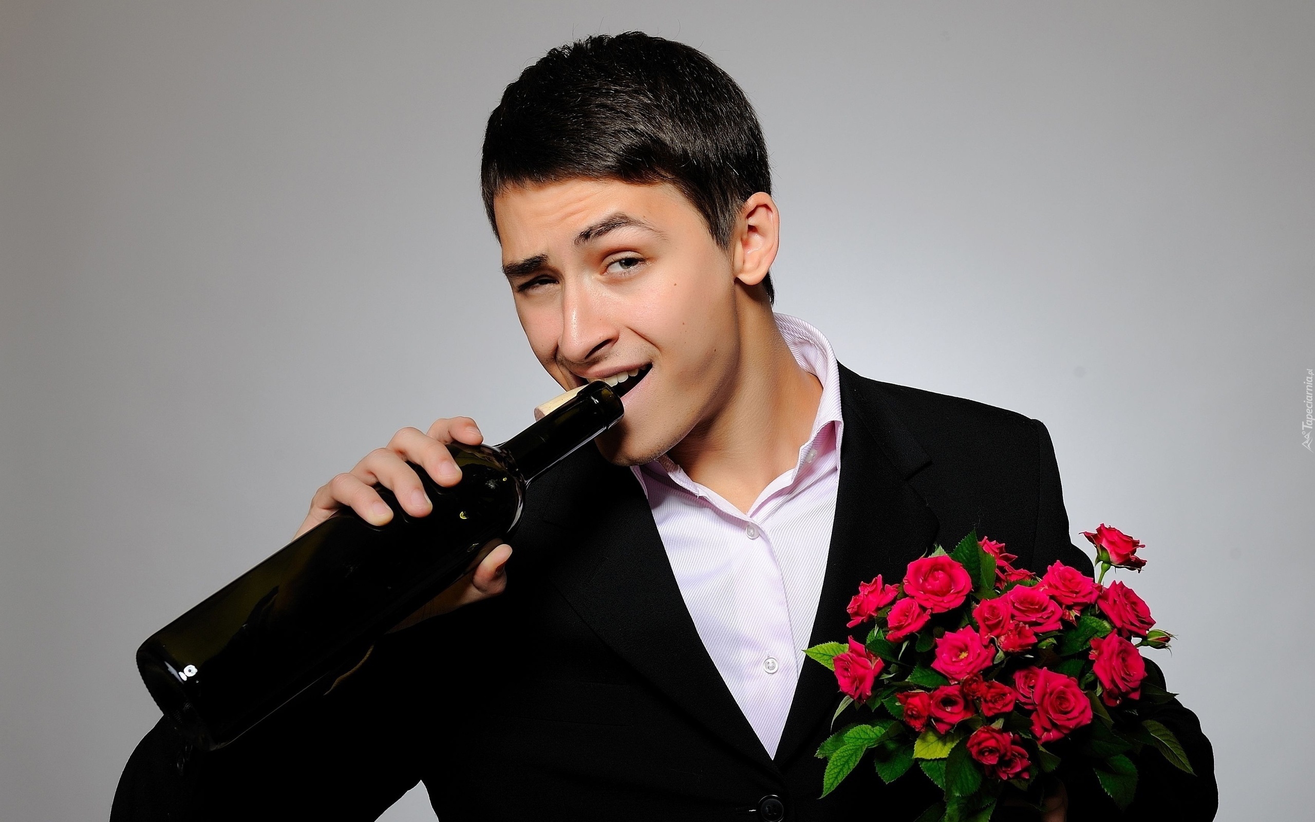 Edytor tapety: Mężczyzna, Uśmiech, Butelka, Bukiet, Róż