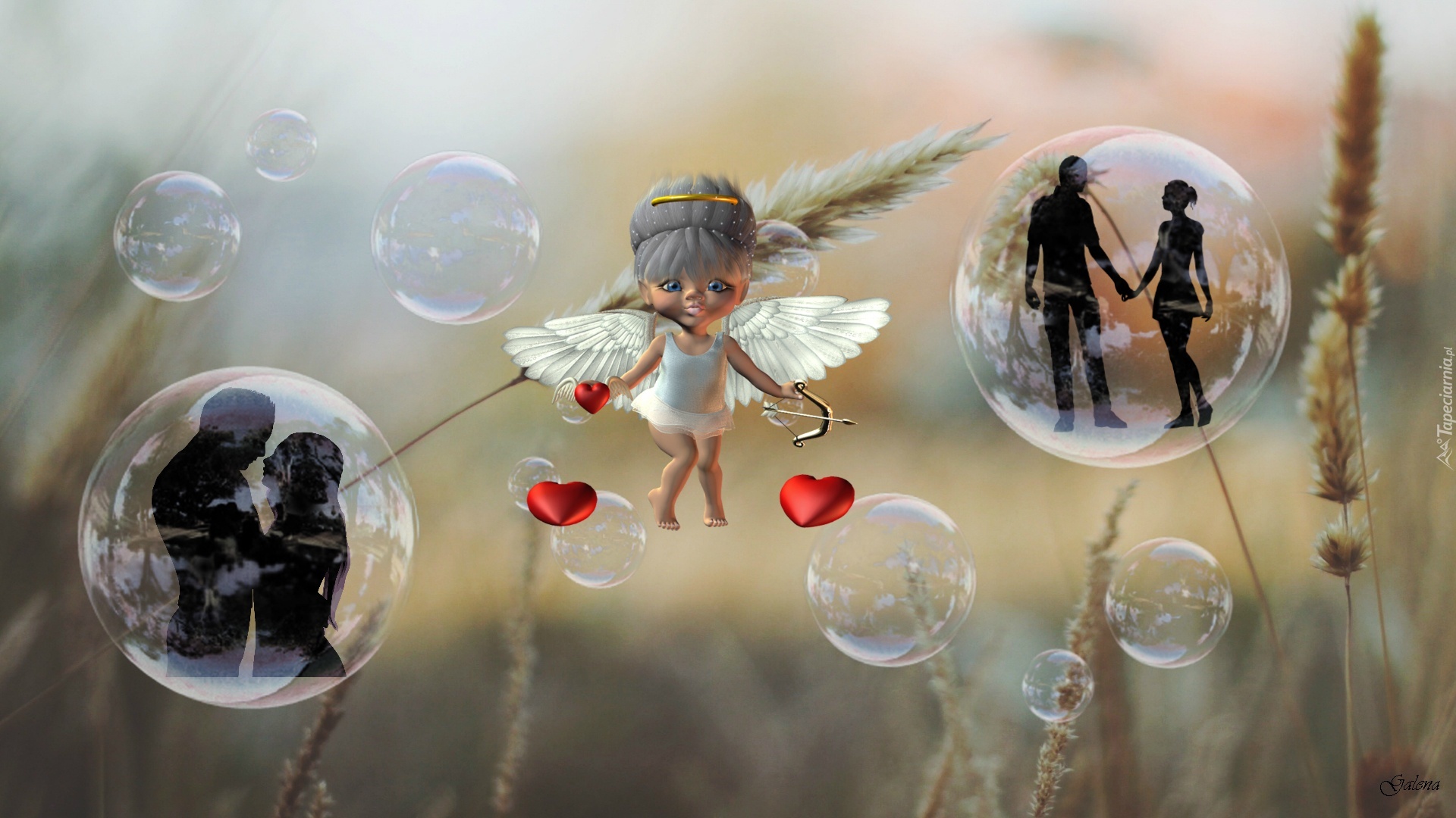 Edytor tapety: Amor, Laleczka, Serca, Bańki, Zakochani, Miłość, Grafika 2D