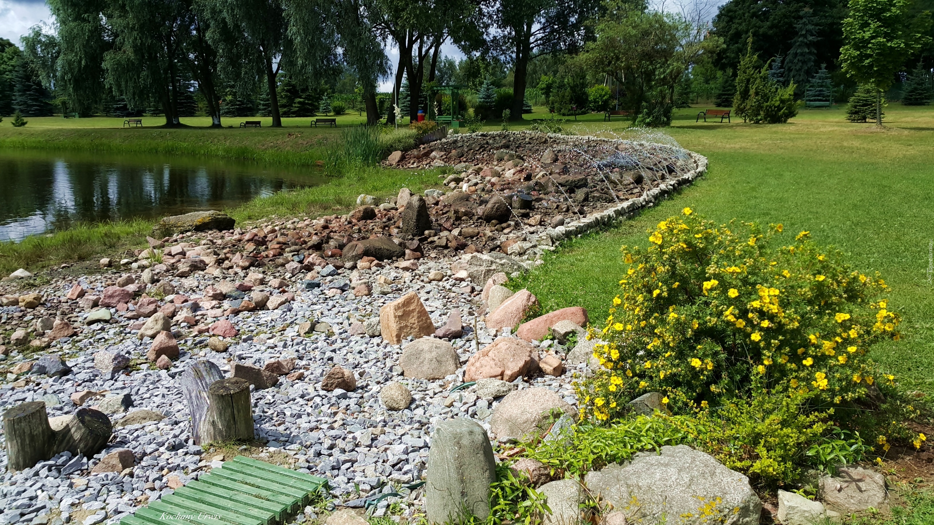 Edytor tapety: Park, Staw, Kamienie, Ławki, Kwiaty