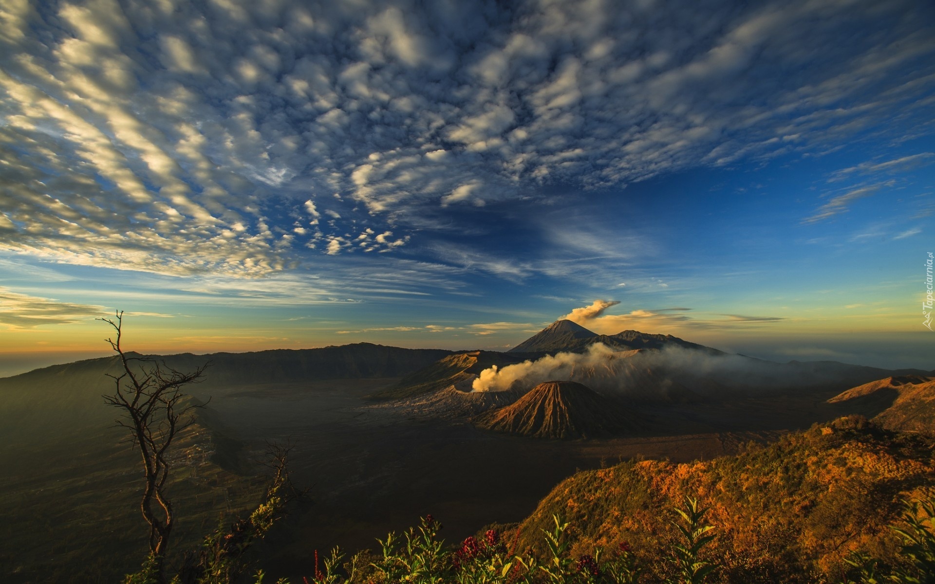 Edytor tapety: Wzgórze, Wulkan, Chmury, Mgła, Drzewo