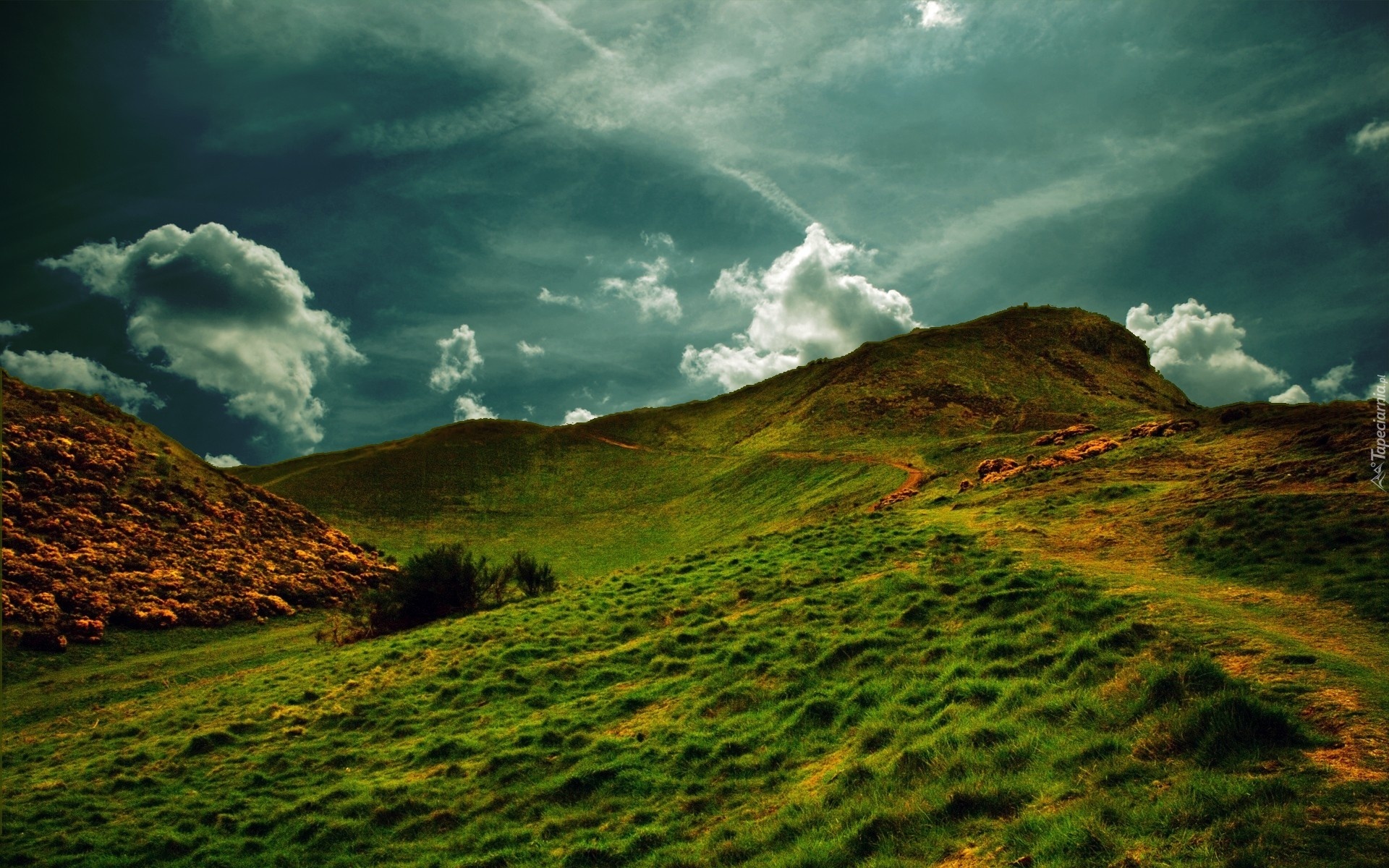 Edytor tapety: Wzgórza, Chmury, Niebo, Trawa