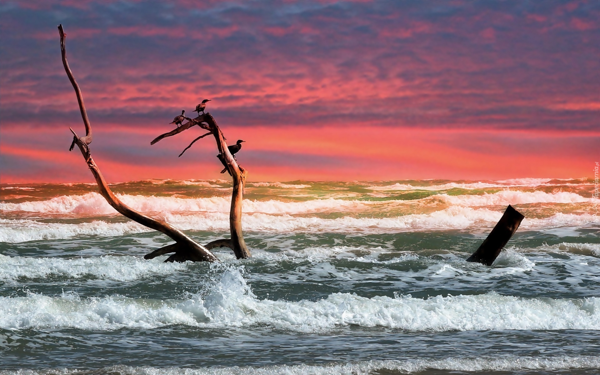 Edytor tapety: Ocean, Fale, Gałąź, Ptaki, Wschód, Słońca