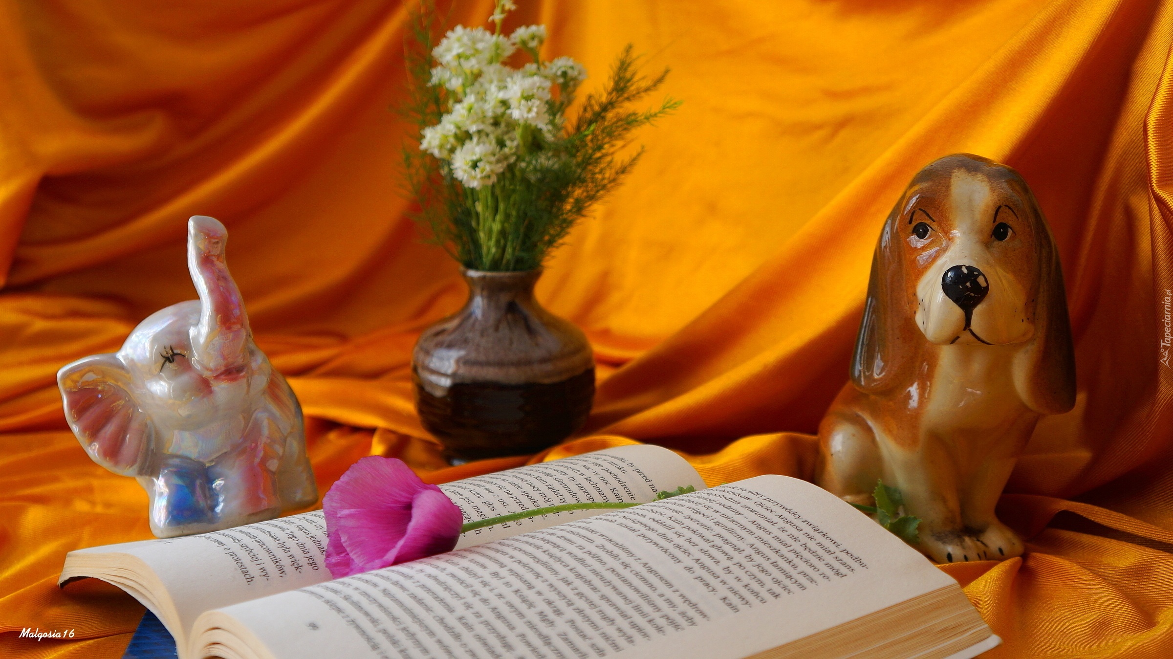 Edytor tapety: Książka, Mak, Figurki, Słonik, Pies, Wazon, Kwiaty
