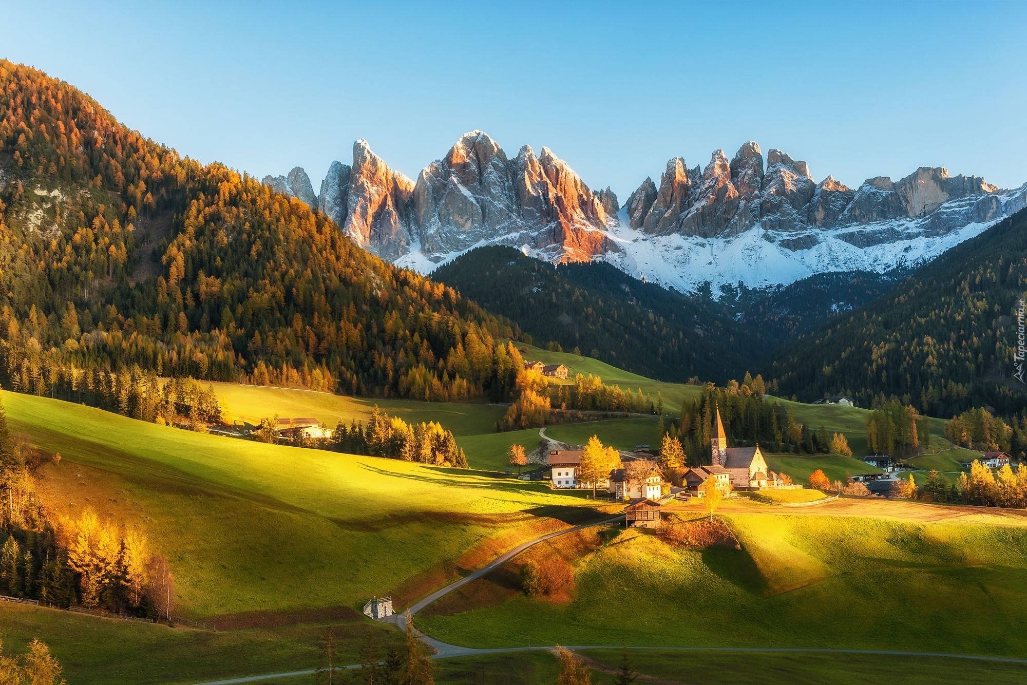 Edytor tapety: Góry, Las, Kościół, Śnieg, Domy, Droga