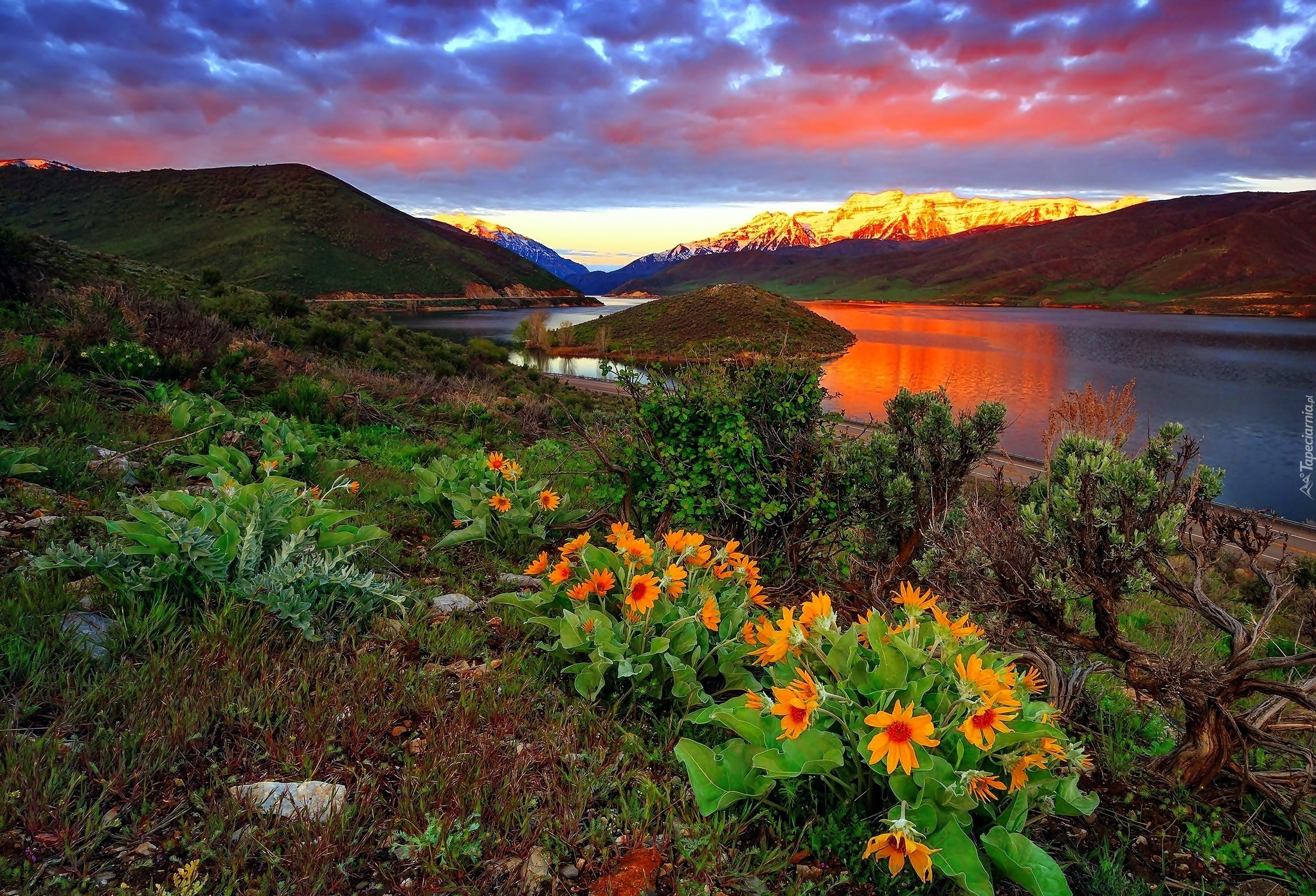 Edytor tapety: Rzeka, Wysepka, Kwiaty, Drzewa, Góry, Zachód, Słońca