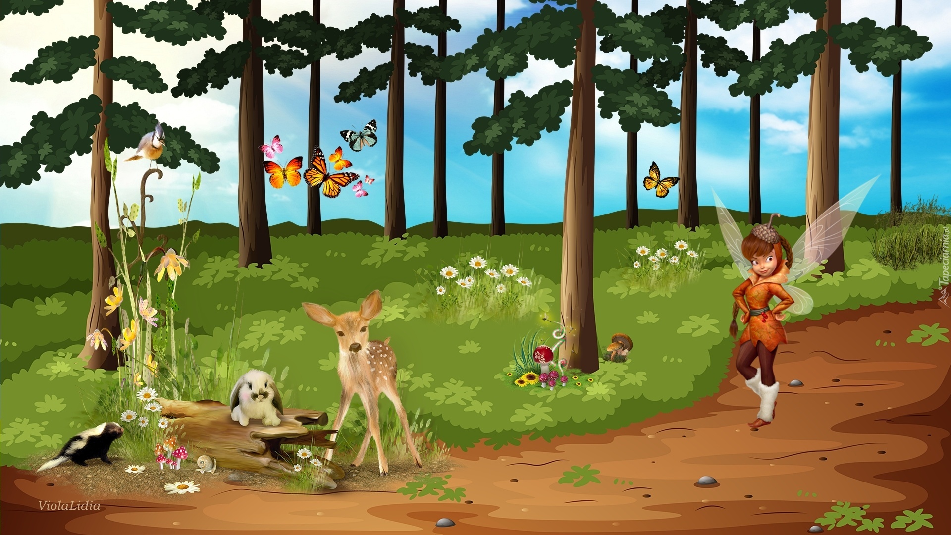 Edytor tapety: Grafika, Las, Droga, Zwierzęta, Sarenka, Laleczka, Elf