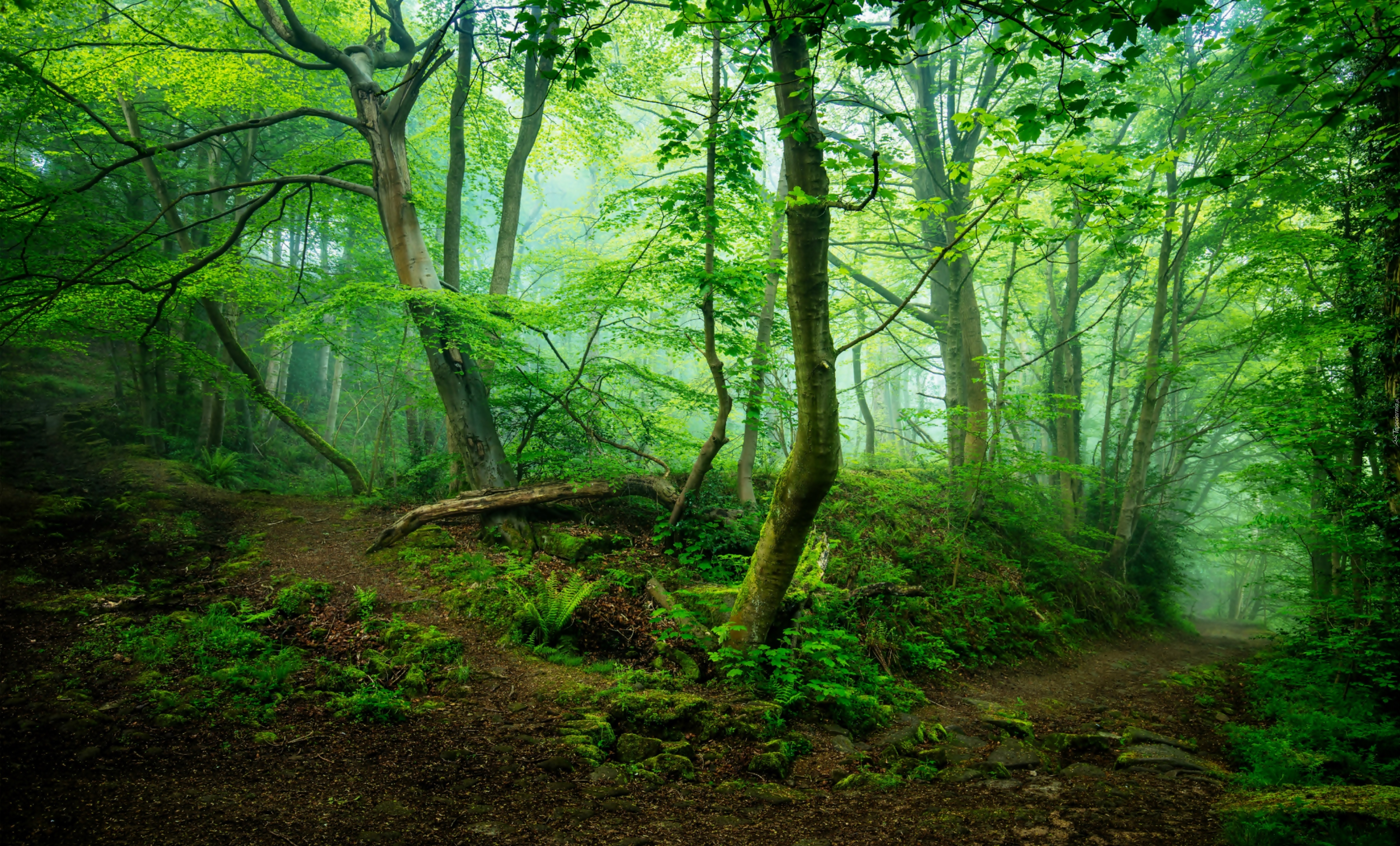 Edytor tapety: Zielony, Las, Drzewa, Ścieżka, Mgła, Poranek, Wielka, Brytania