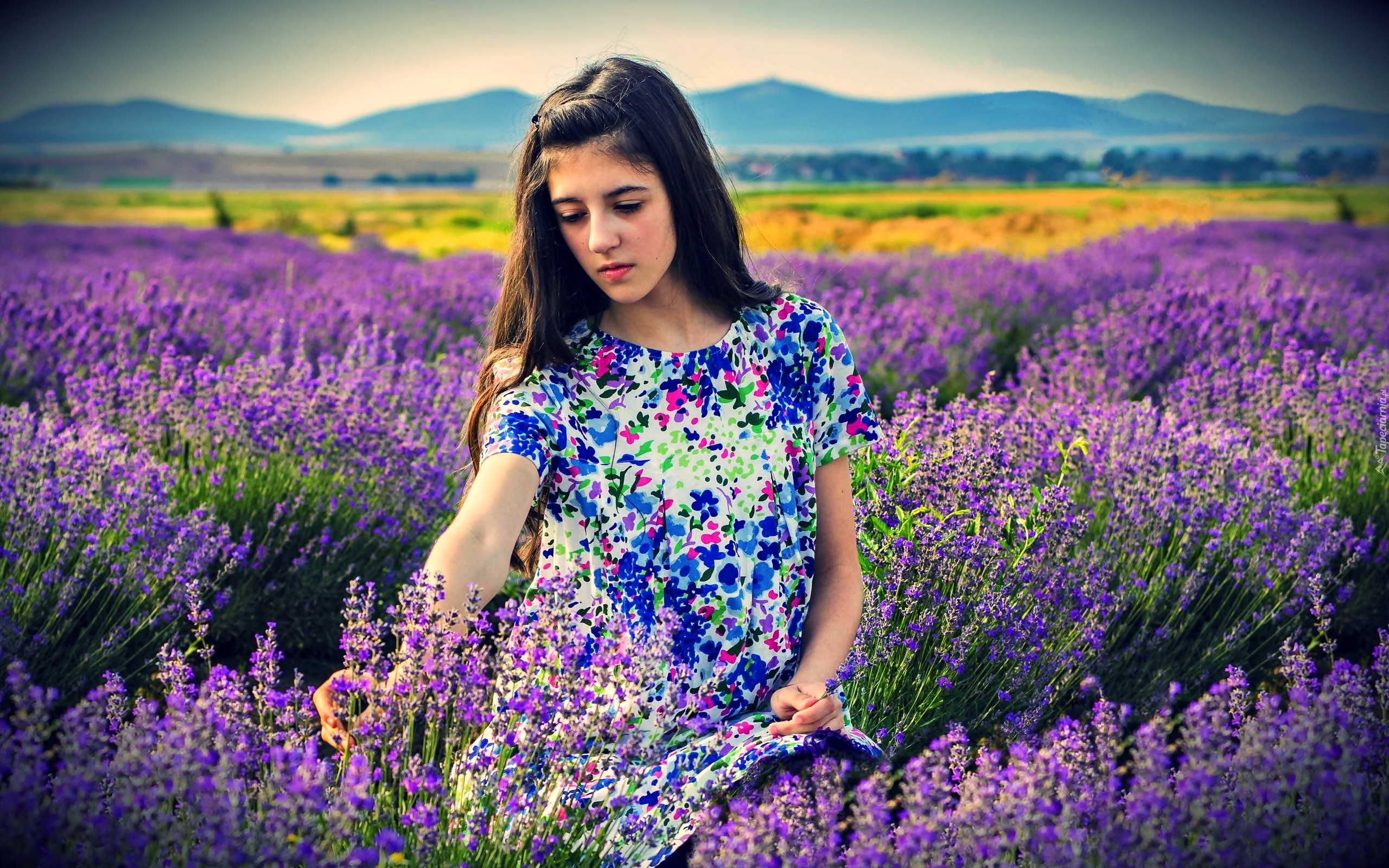 Edytor tapety: Lawendowe, Pole, Kobieta, Kwiecista, Sukienka