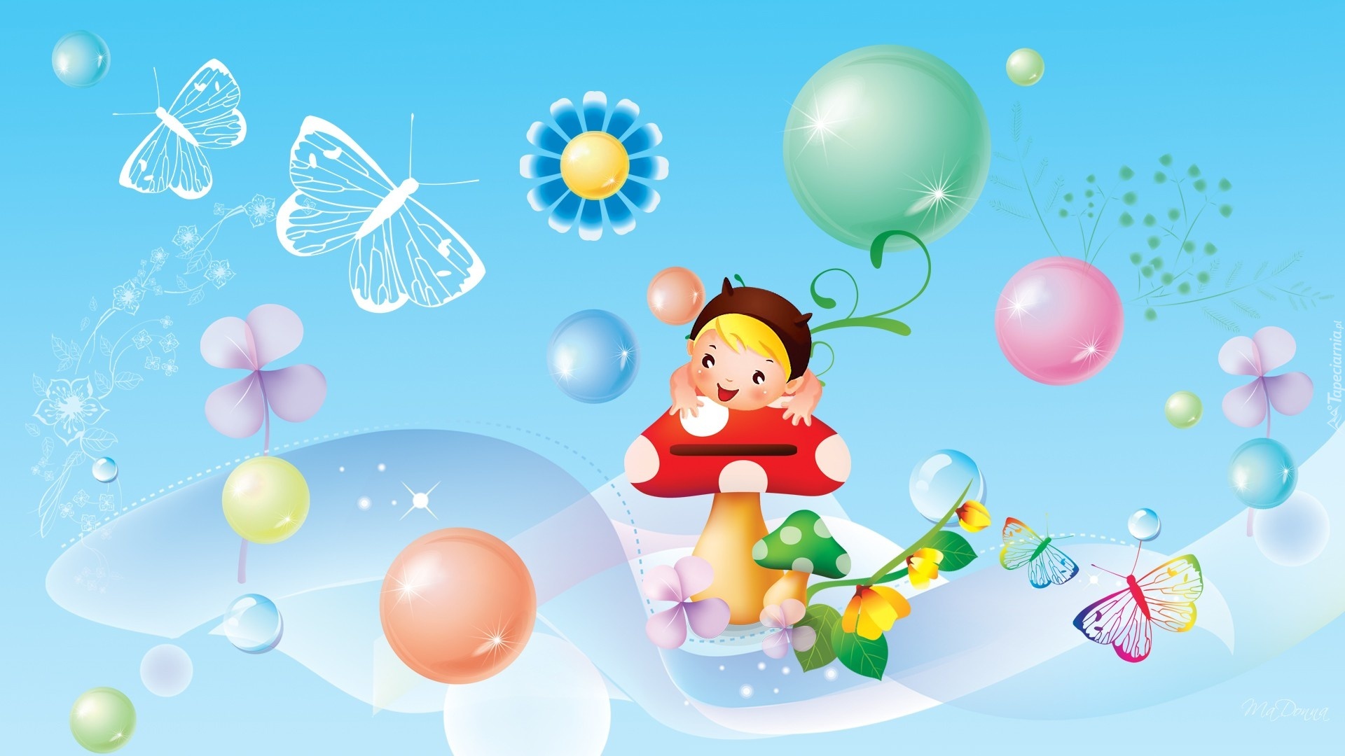 Edytor tapety: Grzybek, Dziewczynka, Motyle, Kwiaty, Bąbelki