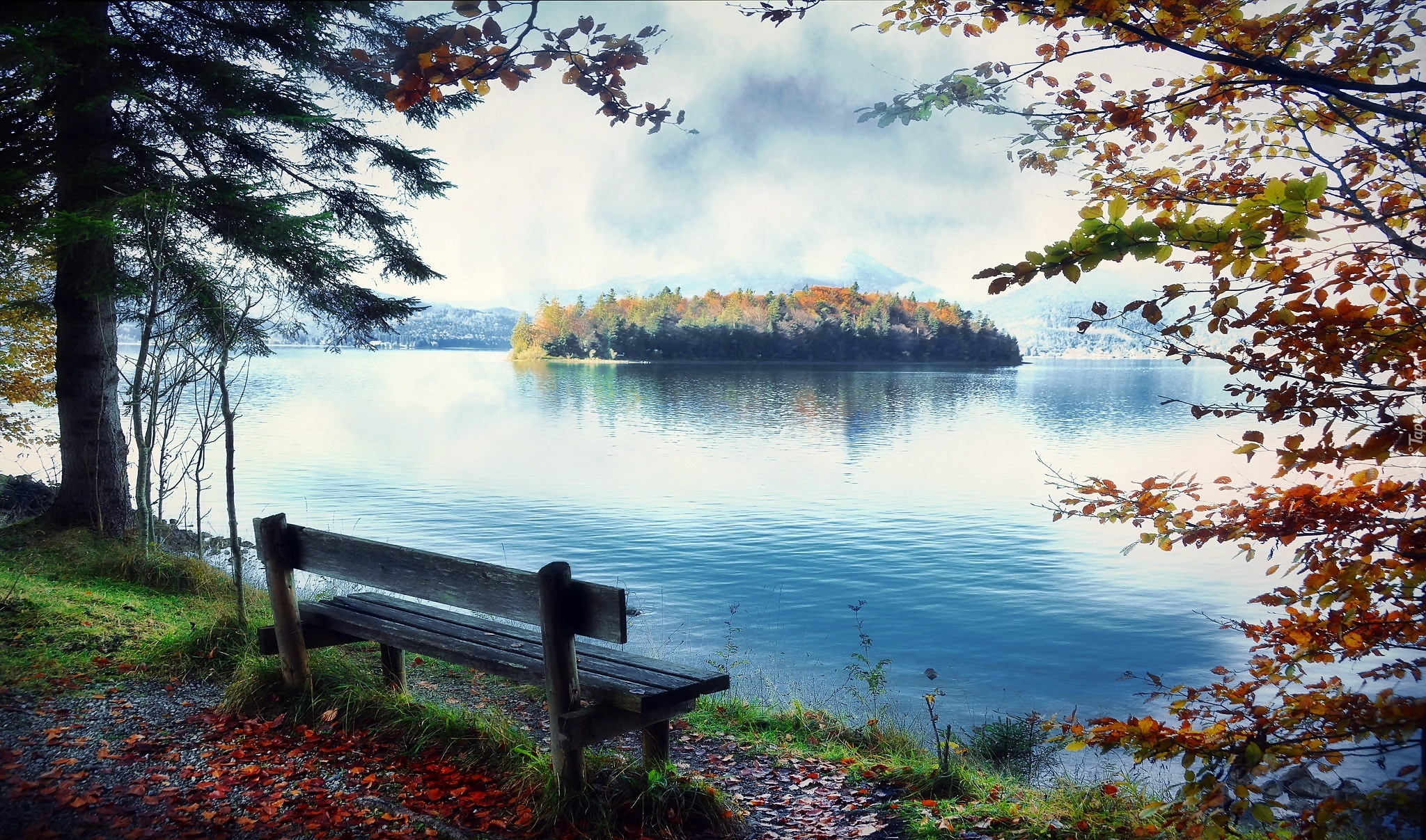 Edytor tapety: Jezioro, Wyspa, Ławeczka, Ławka, Drzewa