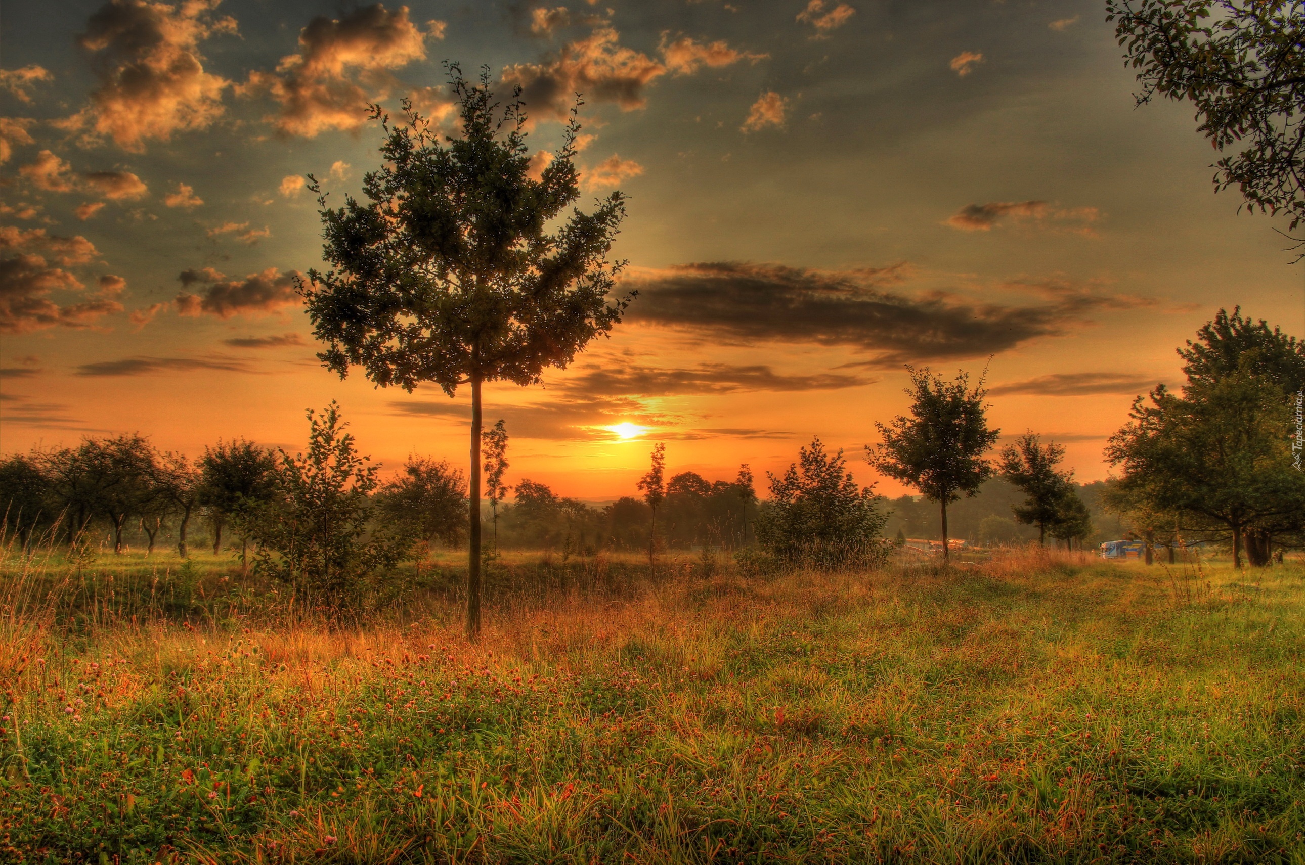 Edytor tapety: Łąka, Zachód, Słońca, Drzewka
