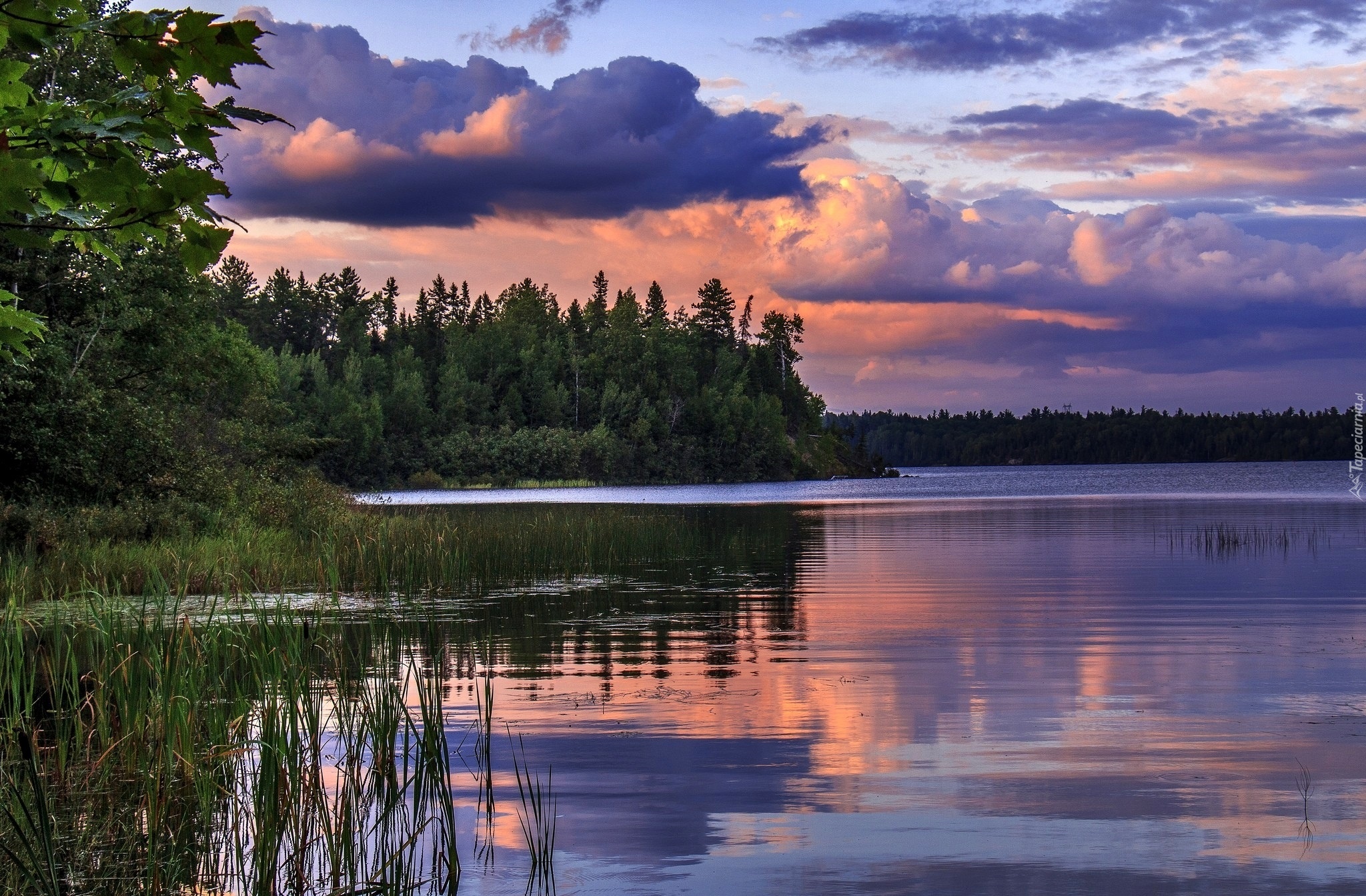 Edytor tapety: Jezioro, Drzewa, Trawy, Chmury, Zachód, Słońca
