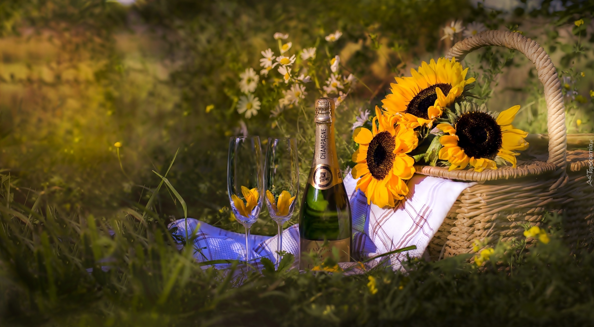 Edytor tapety: Koszyk, Słoneczniki, Szampan, Kieliszki, Łąka, Piknik, Bokeh