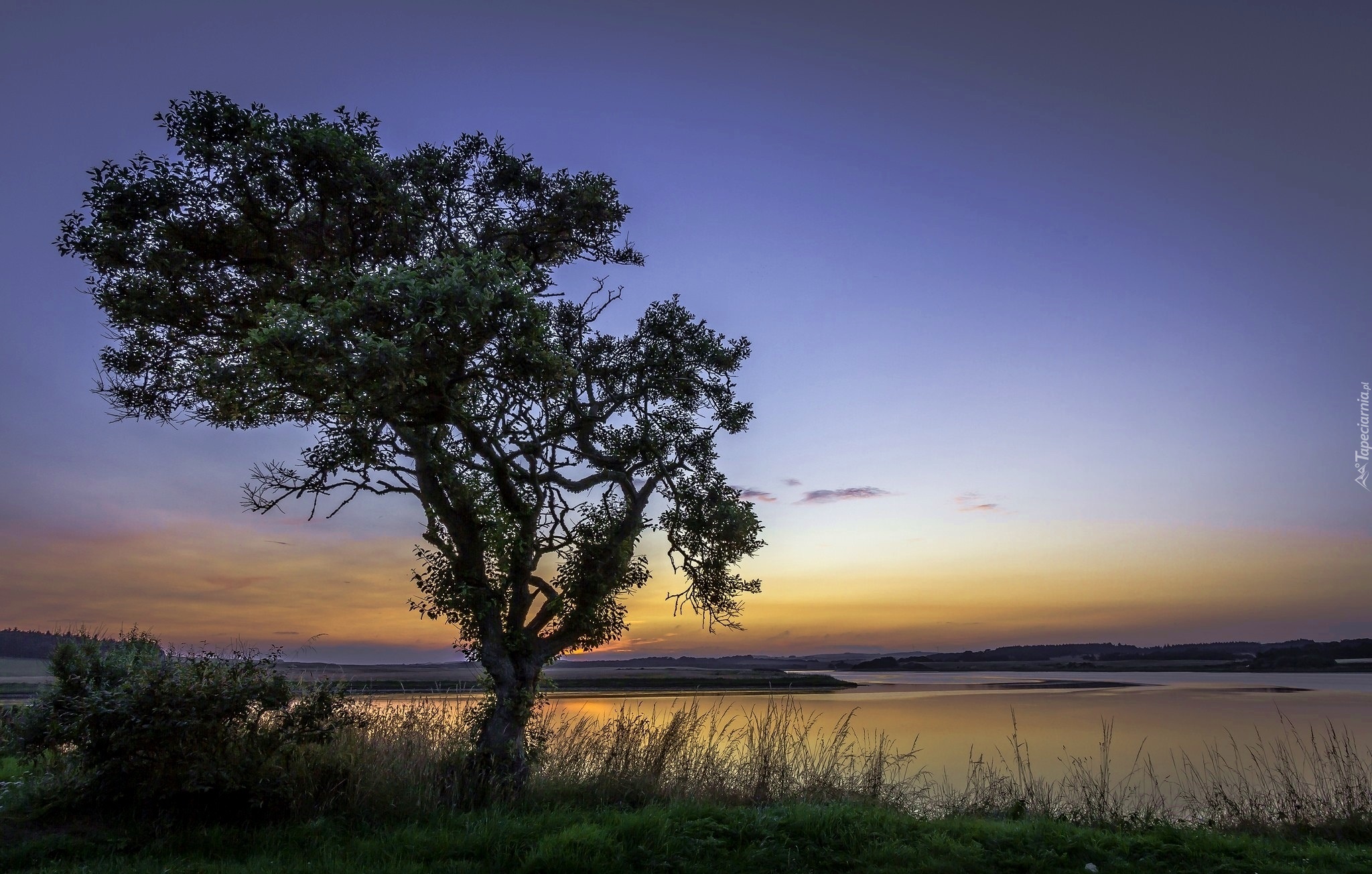 Edytor tapety: Jezioro, Drzewo, Wschód, Słońca