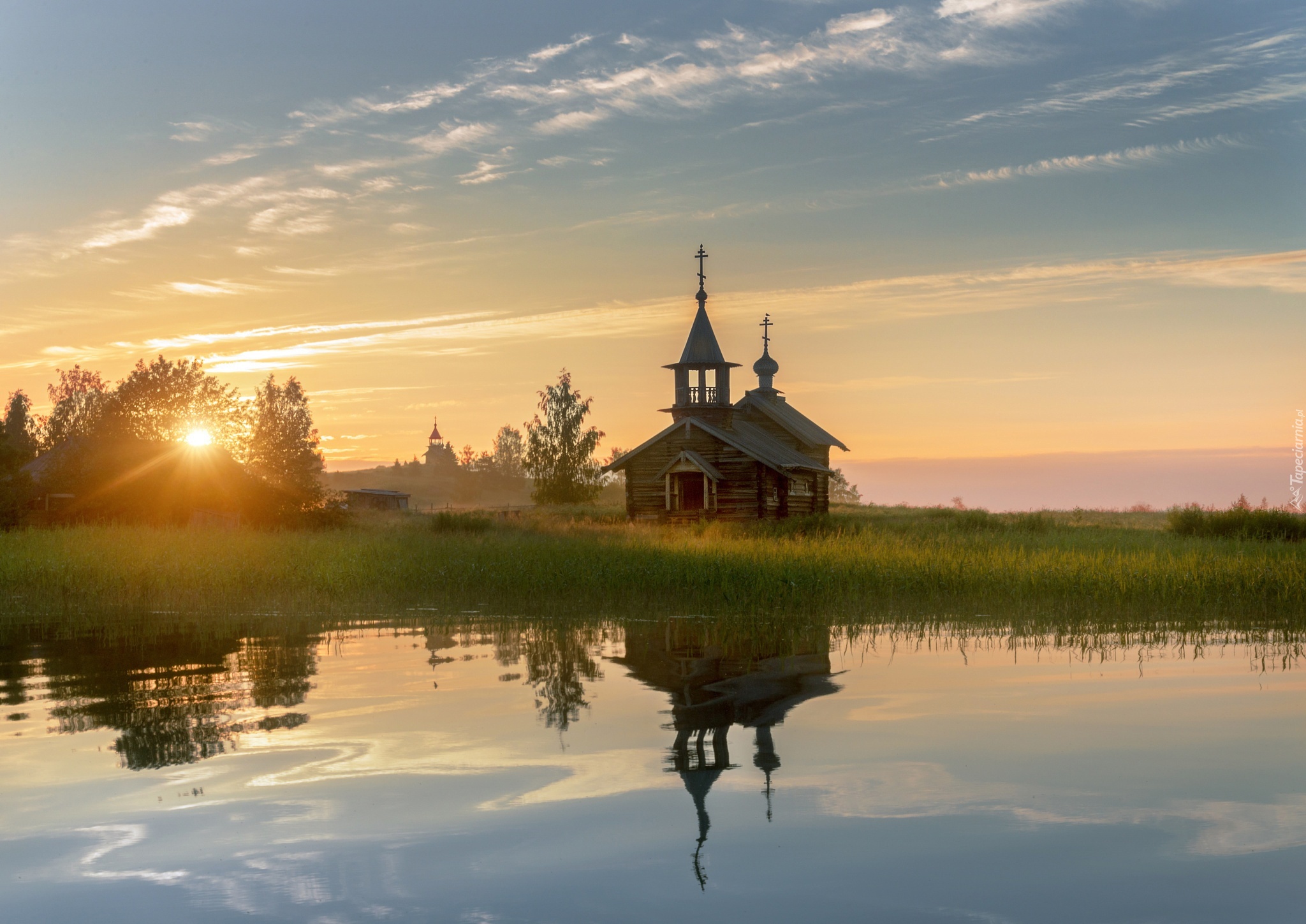 Edytor tapety: Wschód, Słońca, Jezioro, Drewniany, Kościół, Drzewa