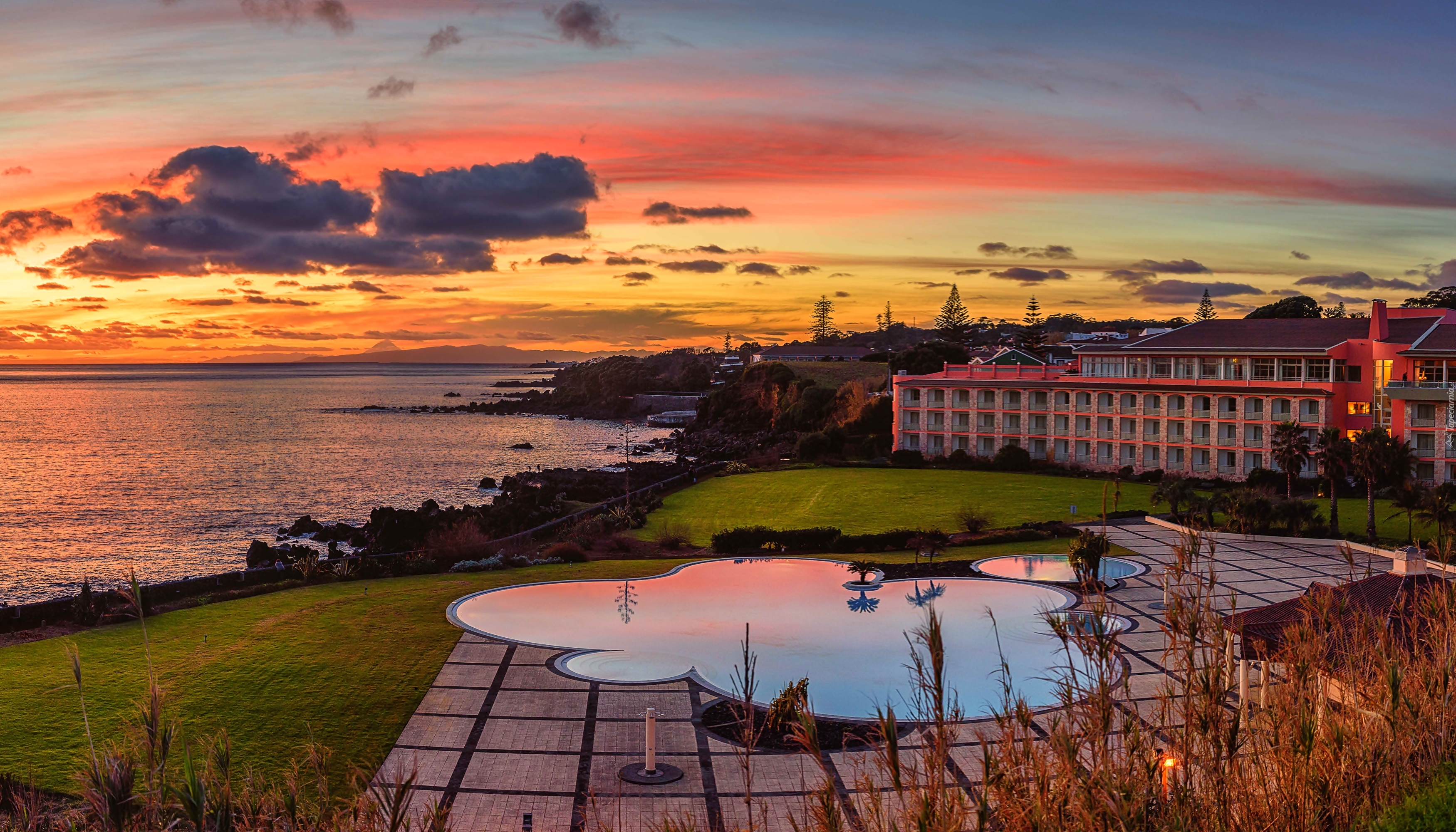 Edytor tapety: Basen, Willa, Morze, Krzewy, Trawa, Zachód Słońca