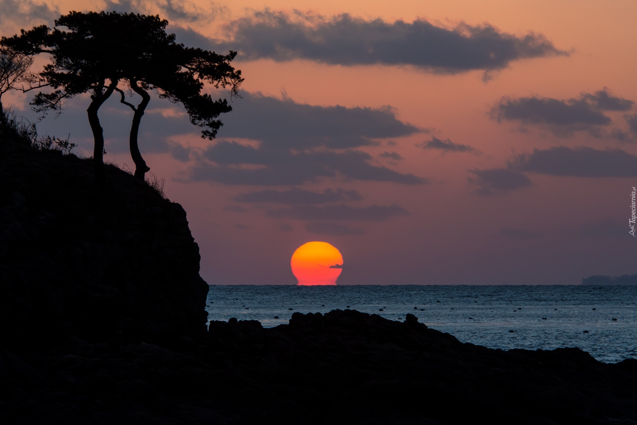 Edytor tapety: Morze, Zachód, Słońca, Drzewa, Skały, Chmury