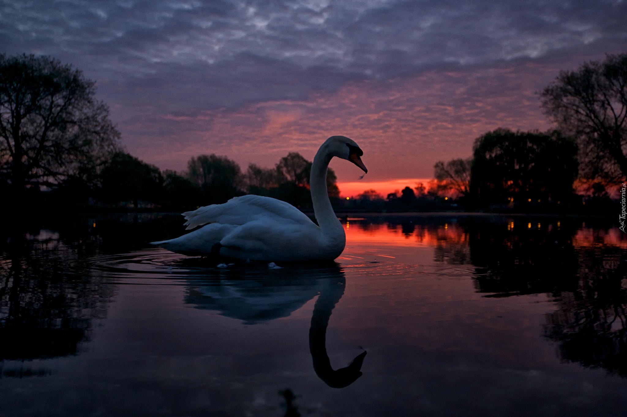 Edytor tapety: Zachód, Słońca, Jezioro, Łabędź, Drzewa