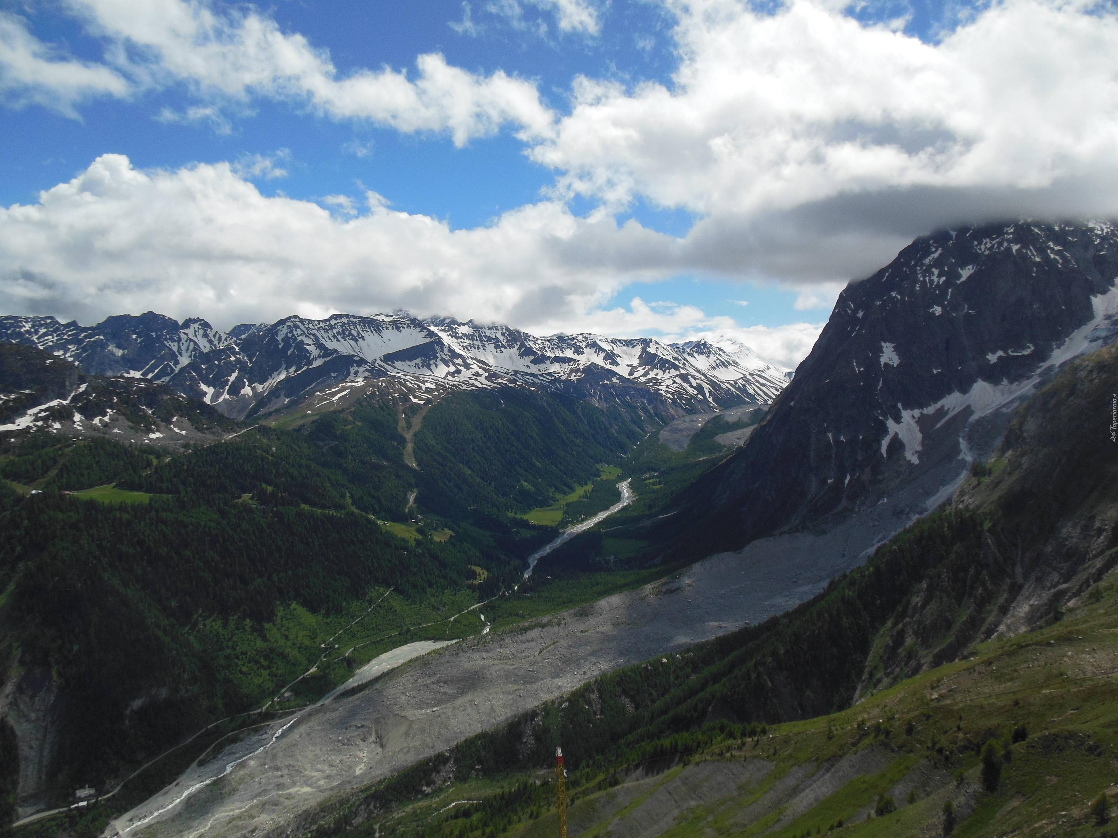 Edytor tapety: Góry, Śnieg, Drzewa, Rzeka, Chmury