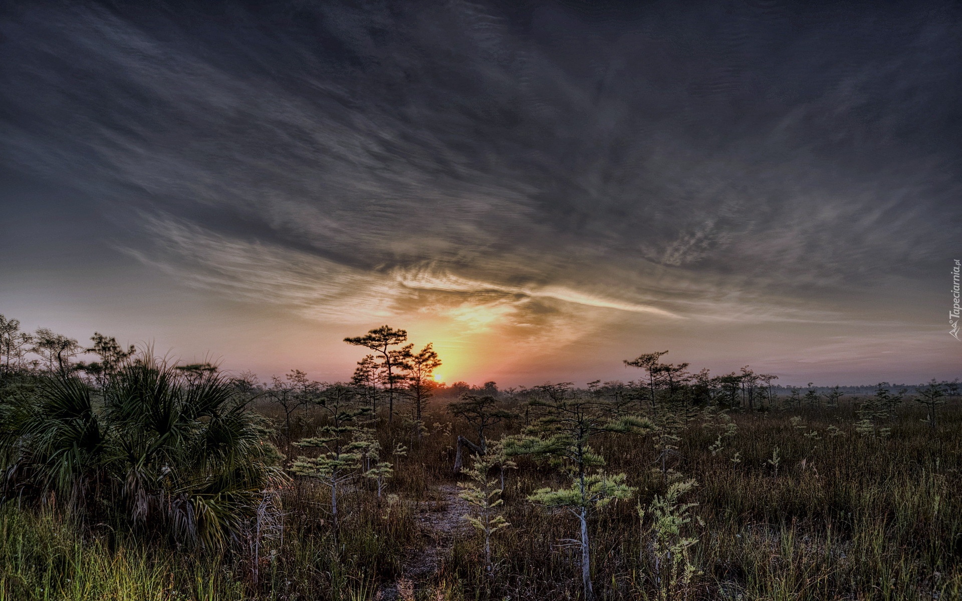 Edytor tapety: Las, Drzewa, Trawy, Zachód, Słońca