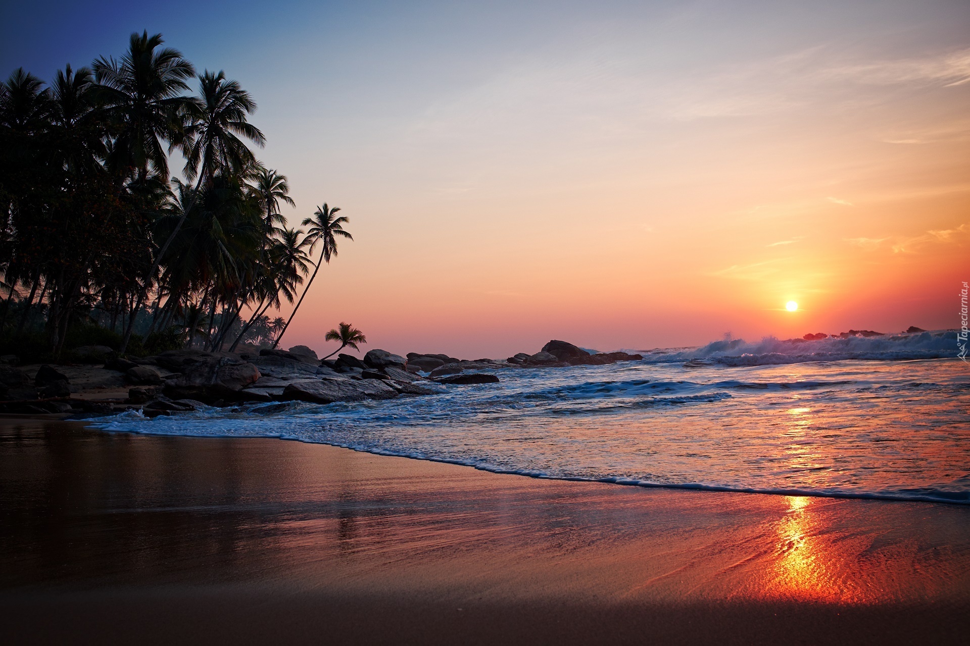 Edytor tapety: Zachód, Słońca, Morze, Plaża, Palmy, Skały