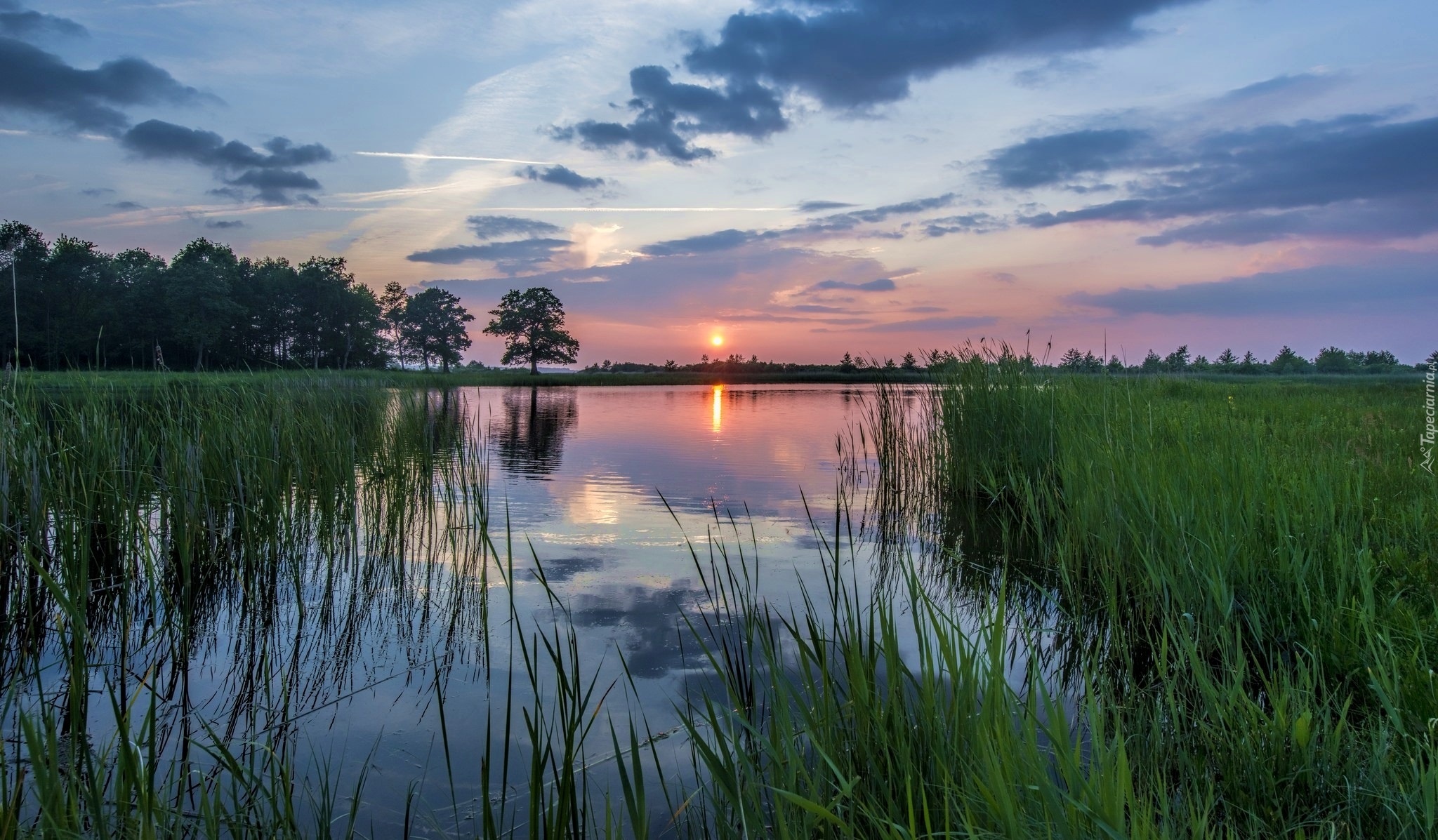 Edytor tapety: Jezioro, Trawa, Drzewa, Zachód słońca
