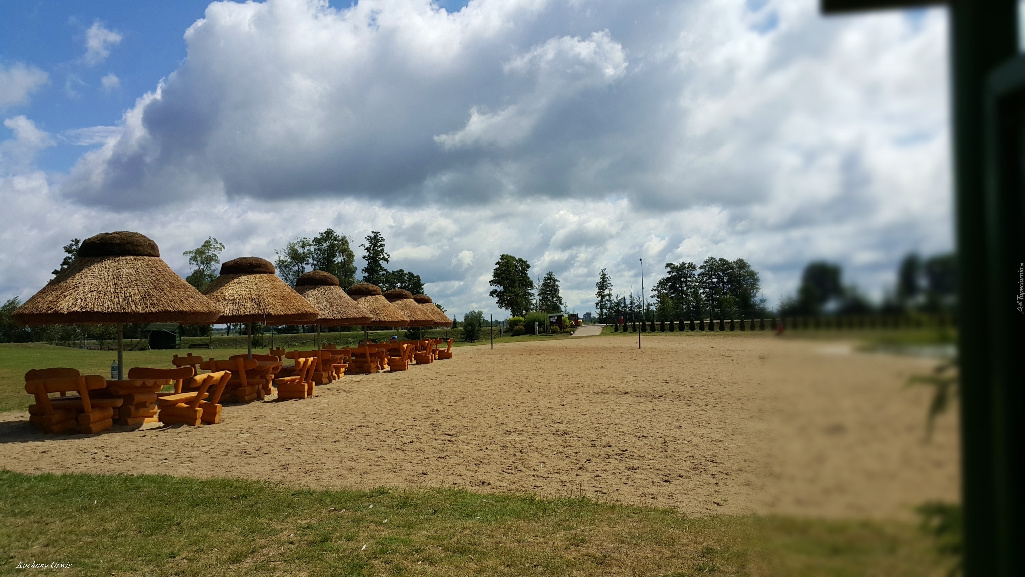 Edytor tapety: Chmury, Niebo, Piasek, Parasole, Ławki, Drzewa